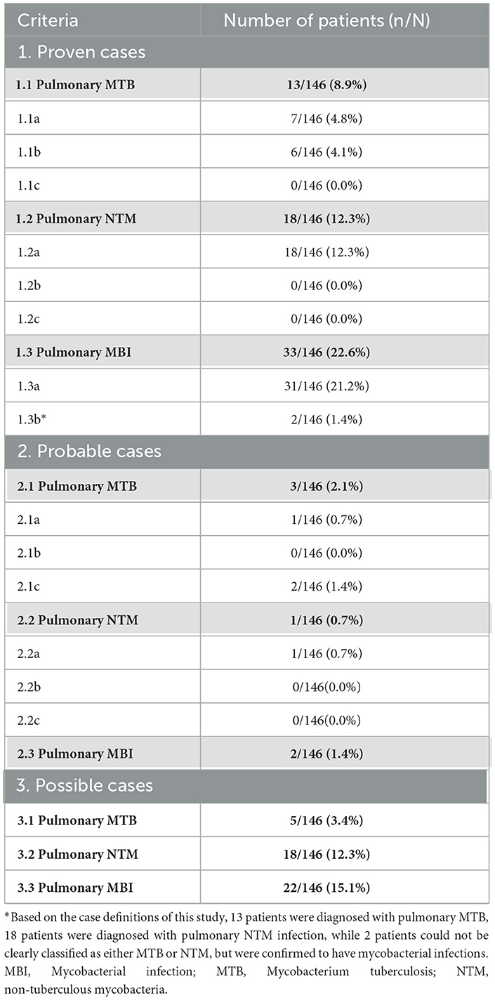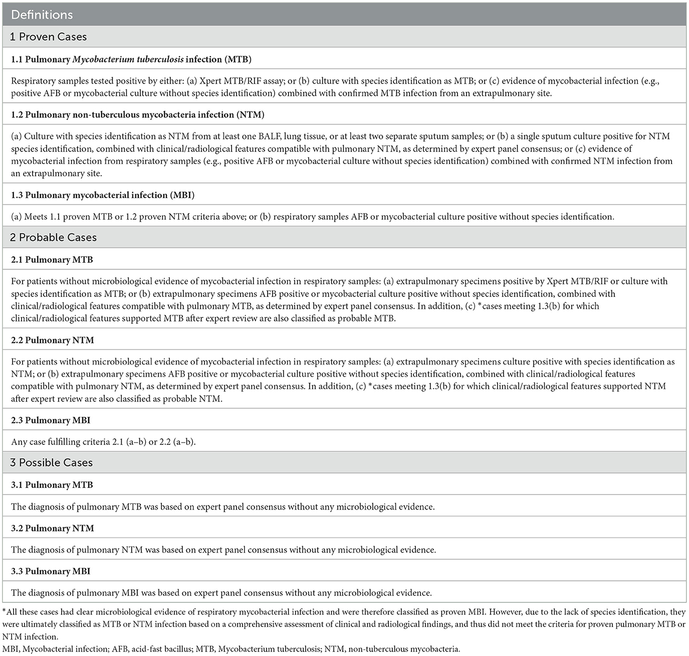 We applied a composite reference standard (CRS) to pulmonary MBI, pulmonary MTB, and pulmonary NTM infection, categorizing each into three diagnostic confidence levels: “Proven,” “Probable,” and “Possible” (Daley et al., 2020; Miao et al., 2025; World Health Organization, 2024). The detailed criteria are summarized in Table 1, and the corresponding case numbers are presented in Table 2. Proven cases were defined by microbiological confirmation from respiratory samples, meeting the following criteria: (1) Evidence of pulmonary mycobacterial infection: at least one respiratory sample positive for mycobacteria by culture, Xpert MTB/RIF, or other validated microbiological methods; and (2) Species-level identification: for classification into MTB or NTM infection, species identification was required. Cases with pulmonary mycobacterial isolates not identified to species level could be classified as proven MBI, but not further distinguished into MTB or NTM. Probable cases were defined as those without microbiological confirmation from respiratory specimens, but in which mycobacteria were detected in extrapulmonary specimens, or mycobacterial infection was confirmed without species identification, and the expert panel reached diagnostic consensus supporting pulmonary involvement. Possible cases were defined solely based on expert panel consensus, in the absence of any microbiological evidence. Of note, a single positive sputum culture required corroborating histopathological or radiological evidence, along with compatible clinical features, to rule out contamination or colonization. The mNGS results were classified as false positive when mycobacterial sequences were detected by mNGS, but the case did not meet the CRS, and was further adjudicated by a multidisciplinary clinical expert panel as not having active mycobacterial disease.