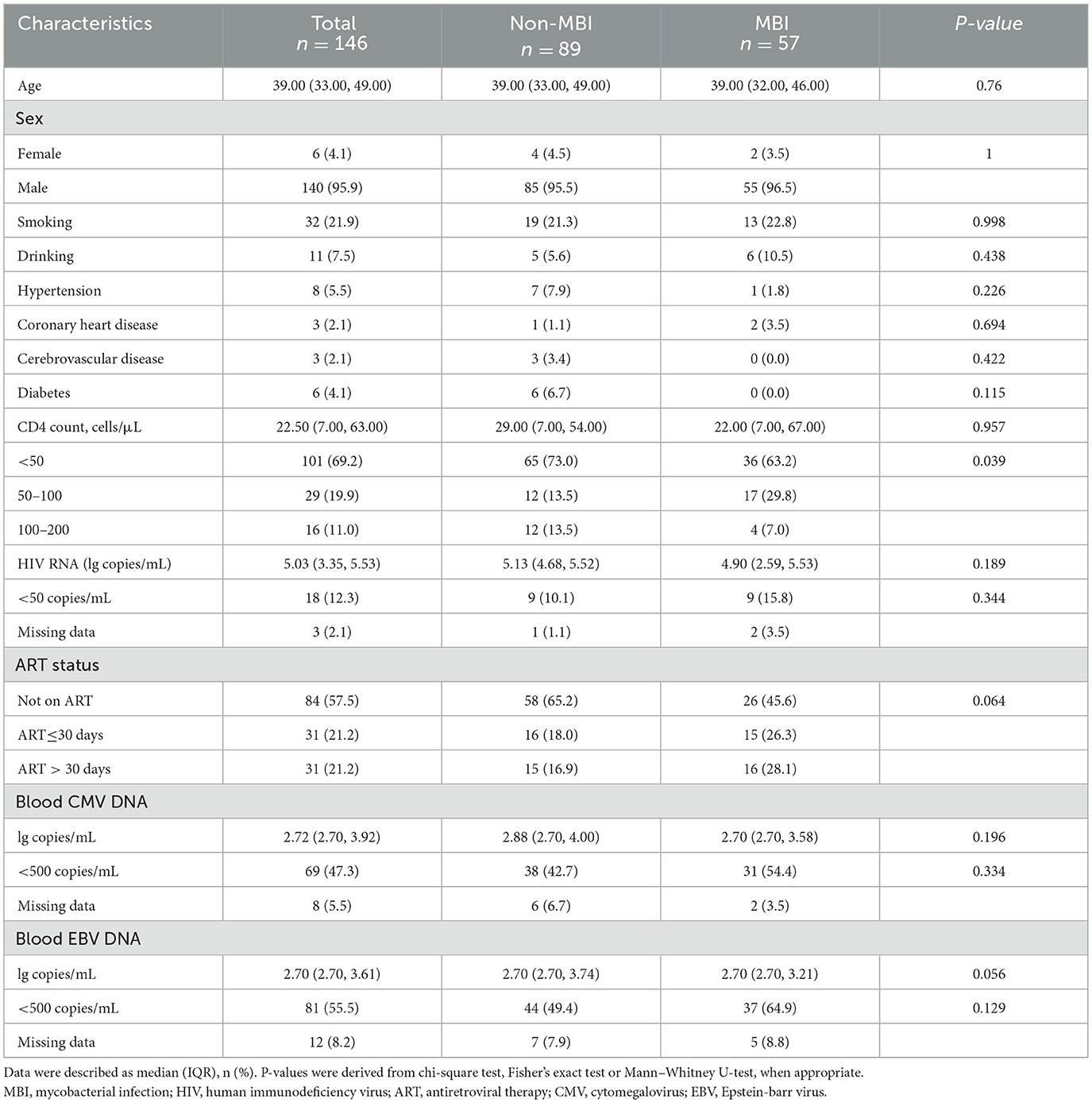 Among the 146 participants, 57 (39.0%) were diagnosed with MBI, while 89 (61.0%) were not. The characteristics of the patients included in the study are summarized in Table 3. Patients were generally young, with a median age of 39.0 (IQR: 33.0–49.0) years. Most participants were male (95.9%). A total of 32 (21.9%) patients had a history of smoking. The median CD4+ T cell count was 22.5 (IQR: 7.0–63.0) cells/uL, with 101 (69.2%) patients having a CD4+ T cell count < 50/uL. The study population exhibited elevated HIV viral replication, with an overall median viral load of 5.03 log10 copies/mL (IQR: 3.35–5.53). The majority of patients (84; 57.5%) were not on antiretroviral treatment (ART), 31 (21.2%) had initiated ART within the past 30 days, and another 31 (21.2%) had received ART for more than 30 days. No independent predictors of BALF mNGS positivity were identified in the multivariable analysis (Supplementary Table 1). A non-significant trend toward higher detection was observed among patients with radiological findings compatible with mycobacterial infection (adjusted OR = 1.84, 95% CI: 0.82–4.18).