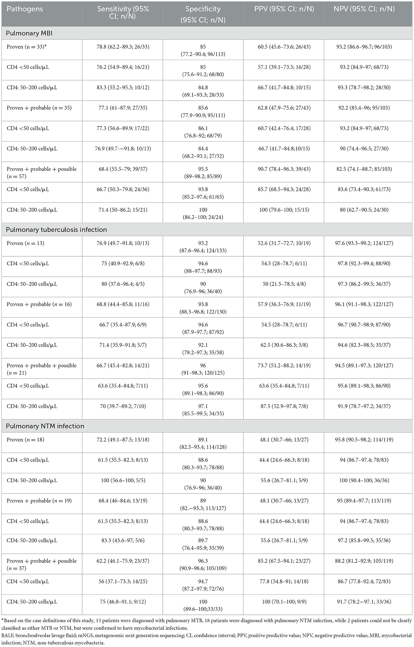 Recent advancements in metagenomic next-generation sequencing (mNGS) provide a promising solution to the diagnostic challenges posed by pulmonary MBI in PWH. Unlike conventional diagnostic methods that rely on predefined targets, mNGS enables unbiased detection of diverse pathogens in a single assay, making it theoretically capable of identifying all potential pathogens present in a sample. This unbiased approach circumvents the need for specific hypotheses regarding the etiology of infection, allowing for comprehensive pathogen identification (Gu et al., 2019; Miller and Chiu, 2022). This novel technique has demonstrated high sensitivity and specificity in detecting pathogens across various clinical specimens from different infection sites, such as the central nervous system (CNS) and the lungs (Zhu et al., 2022a,b; Fang et al., 2020; Chen et al., 2022; Miao et al., 2018; Yan et al., 2021; Huang et al., 2020). However, available evidence remains limited regarding the role of mNGS in distinguishing pulmonary mycobacterial infections in PWH. The present study aimed to assess the effectiveness of mNGS of bronchoalveolar lavage fluid (BALF) in aiding the diagnosis of pulmonary mycobacterial infections in PWH. Our study primarily focused on MTB and NTM, systematically evaluating the diagnostic performance of BALF mNGS using standardized criteria, with particular emphasis on interpreting polymicrobial infections involving mycobacteria and other co-pathogens.