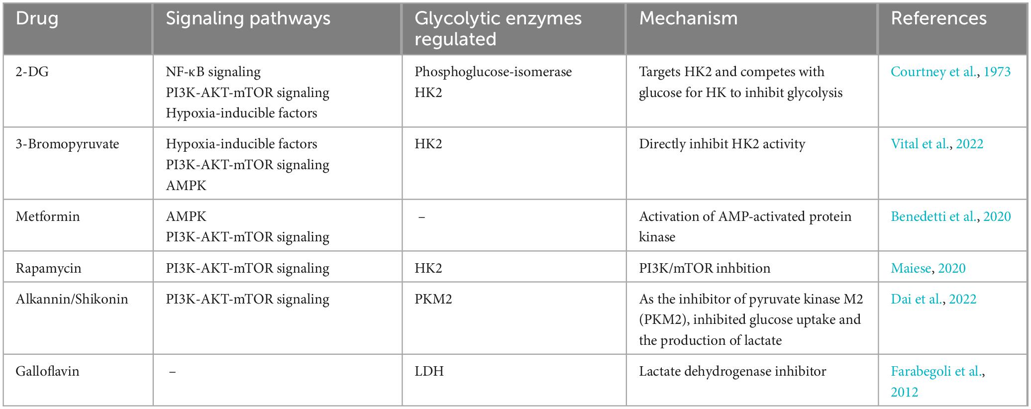 Research on drugs that target reprogramming of glucose metabolism in viral infections is still ongoing. There are relatively few drugs that directly target reprogramming of glucose metabolism due to viral infections, and some antiviral drugs may indirectly affect glucose metabolism while treating viral infections. For example, influenza virus replication is dependent on host cell glucose in a dose-dependent manner, and treatment of infected cells with glycolysis inhibitors may reduce viral replication (Kohio and Adamson, 2013). Studies have shown that elevated glucose levels and glycolysis promote replication in monocytes infected with SARS-CoV-2 through a HIF-1 α-dependent pathway, and treatment of cells with the glycolysis inhibitor 2-deoxy-d -glucose (2-DG) blocks viral replication (Codo et al., 2020). 2-DG is a synthetic analog of glucose that interferes with glycolysis. In addition, 2-DG inhibits the PPP pathway and glycosylation of S proteins (Chen et al., 2023). Therefore, the drug 2-DG has been used as an antiviral and anti-inflammatory agent to counteract the cytokine storm in COVID-19 patients (Verma et al., 2020). For decades, 2-DG has been used in a variety of applications, including antiviral, anticancer, and antiepileptic. Broad-spectrum antiviral compounds targeting the PI3K/Akt signaling pathway provide host-mediated antiviral responses in a variety of ways and may be considered the best future candidates for the treatment of COVID-19 and related post-COVID syndromes. Although most PI3K inhibitors are used for the treatment of some forms of cancer, their utility in viral infections has not been fully reported (Lekshmi et al., 2023). It has been shown that BEZ235, an inhibitor of PI3K/mTOR, acts as a modulator of viral production following viral infection and inhibits viral replication by decreasing PI3K and mTOR levels, as well as phosphorylation products, blocking transient induction of c-Myc, and decreasing the homeostasis of the pathway for 4E-BP-1 and P85 phosphorylation (Yu et al., 2022). Preclinical studies have reported that atorvastatin downregulates the HBx protein-induced Akt pathway via purinergic receptor (P2X) and further reduces hepatocyte proliferation and invasiveness (Min et al., 2023). mTOR inhibitors, such as sirolimus, everolimus, and tamsulosin, which block downstream signaling of PI3K/Akt, may also play a role in the treatment of herpesvirus infection (Liu and Cohen, 2015). Overall, the research and development of antiviral drugs targeting glycolytic enzymes and pathways in viral infections have provided new options and ideas for the treatment of viral infections (Table 2).