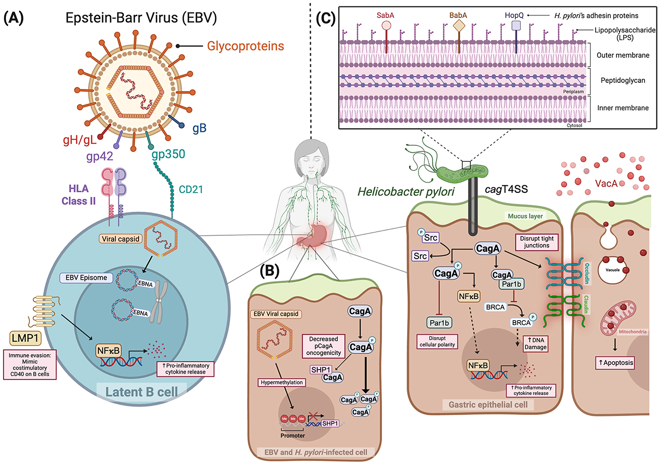 Figure 1. Mechanisms of disease induced by Epstein–Barr virus (A), Epstein-Barr virus and Helicobacter pylori (B), and Helicobacter pylori (C). Figure created in Biorender.com. gp350, Glycoprotein 350; gp42, Glycoprotein 42; gH/gL, Glycoprotein H, Glycoprotein L; gB, Glycoprotein B; LMP1: Latent membrane protein; EBNA, EBV nuclear antigen; NFκB, Nuclear factor kappa B; Src, Proto-oncogene tyrosine-protein kinase; SHP1, Src homology 2 domain-containing phosphatase 1; SabA, Sialic acid binding Adhesin; BabA, Blood group antigen binding Adhesin; HopQ, H. pylori outer membrane Q; CagA, Cytotoxin-associated gene A; cagT4SS, Cytotoxin-associated gene type 4 secretion system; VacA, Vacuolating cytotoxin A; Par1b, Polarity-regulating kinase partitioning-defective 1b; BRCA: Breast cancer gene; HLA: Human leukocyte antigen; CD21: Cluster of differentiation 21.