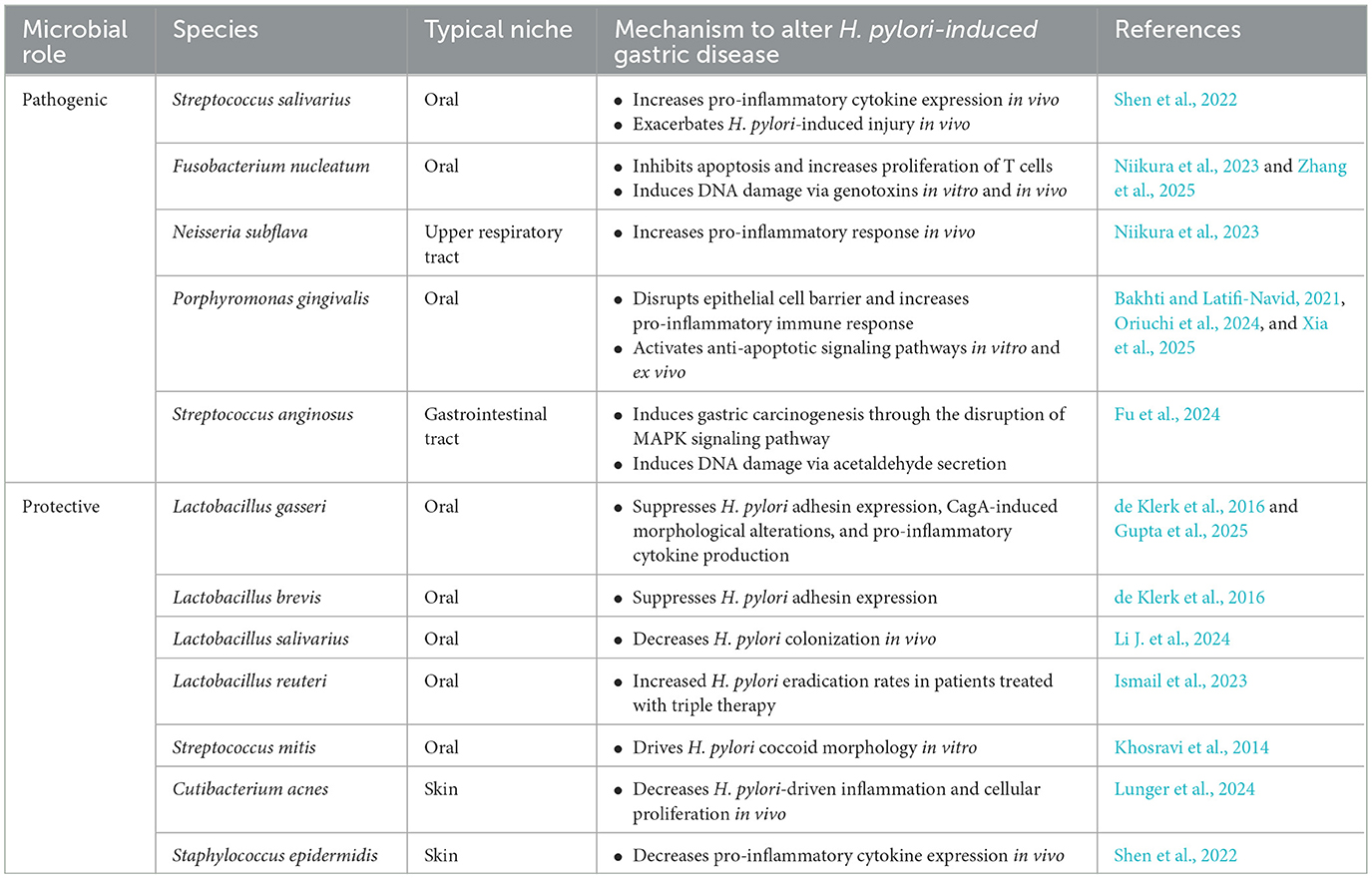 Additional bacterial species have also been identified as contributors to the initiation and progression of gastric cancer, independent of H. pylori. Microbiome analyses of gastric tissue harvested from a subset of patients post-H. pylori eradication revealed a persistent dysbiosis marked by enrichment of Fusobacterium nucleatum, an oral commensal species known to be abundant within colorectal cancer tissue, and Neisseria subflava, a respiratory tract commensal (Bakhti and Latifi-Navid, 2021; Niikura et al., 2023; Zepeda-Rivera et al., 2024) (Table 1). In these patients, increased gastric cancer incidence was observed, which corresponded to elevated levels of DNA damage and induction of pro-inflammatory responses by these species (Niikura et al., 2023; Zhang et al., 2025). Evidence now suggests that F. nucleatum colonizes the intratumoral environment of gastric cancer specimens and recruits tumor-associated neutrophils, which likely facilitate disease progression (Zhang et al., 2025). Porphyromonas gingivalis, an oral pathogen associated with periodontal disease, also exerts pathogenic effects when colonizing the gastric niche by disruption of the gastric epithelial barrier, induction of a heightened immune response through increased TNFα release, and activation of macrophages (Xia et al., 2025) (Table 1). Moreover, P. gingivalis facilitates oncogenesis via activating anti-apoptotic signaling pathways and inducing cellular proliferation (Bakhti and Latifi-Navid, 2021; Oriuchi et al., 2024).