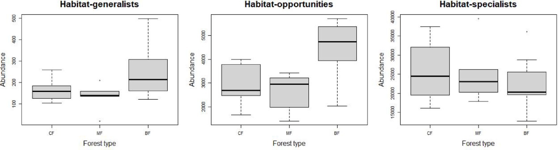 Figure 1. Response of fungal abundance with each habitat specialization group to afforestation types (CF, coniferous forest; MF, mixed forest; BF, broadleaved forest).