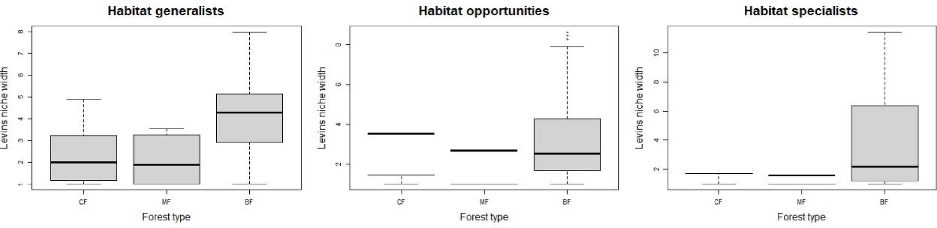 Figure 2. Response of fungal niche breadth among each habitat-specialization group to afforestation types (CF, coniferous forest; MF, mixed forest; BF, broadleaved forest).