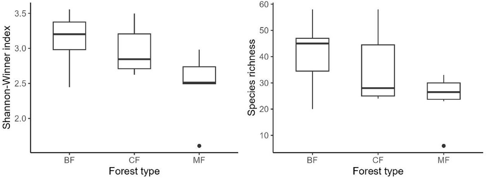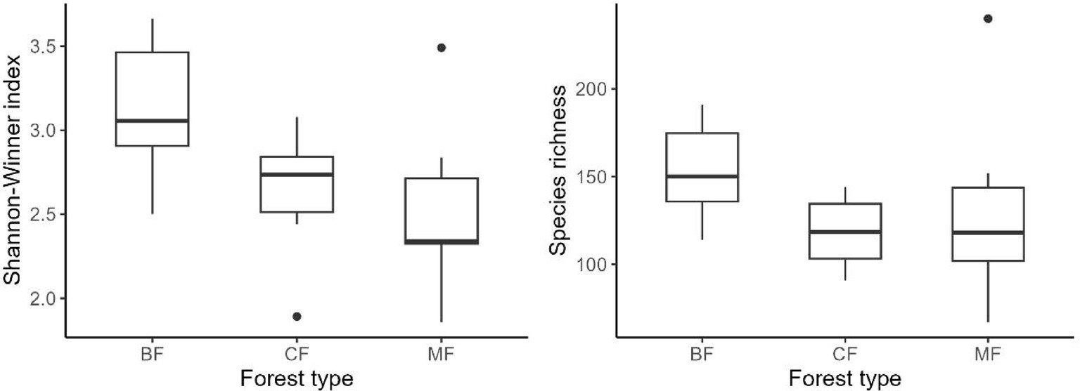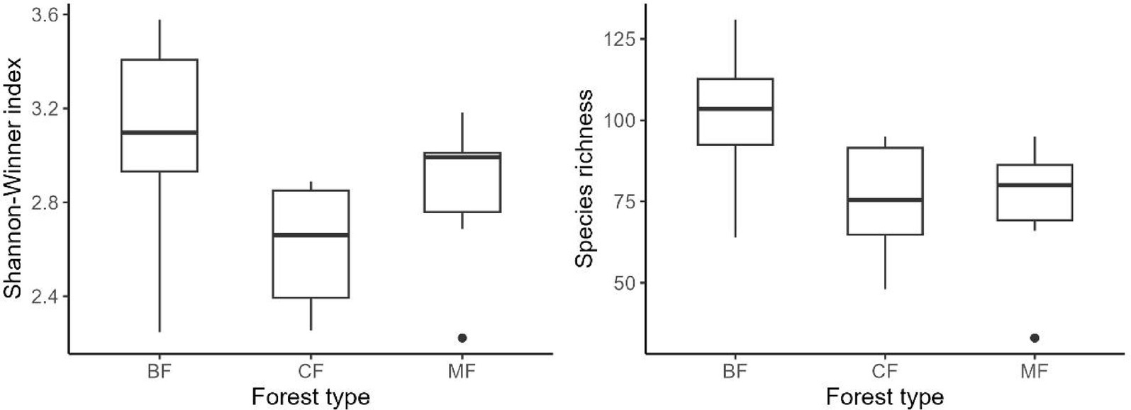 Figure 5. Response of species richness and Shannon-Winner index of habitat specialists to forest stands (CF, coniferous forest; MF, mixed forest; BF, broadleaved forest).