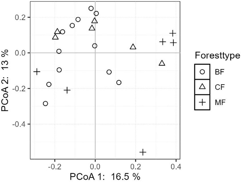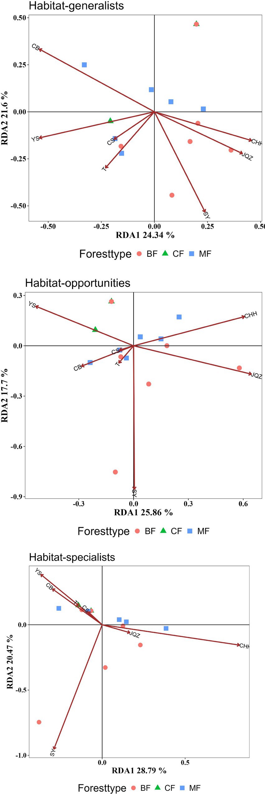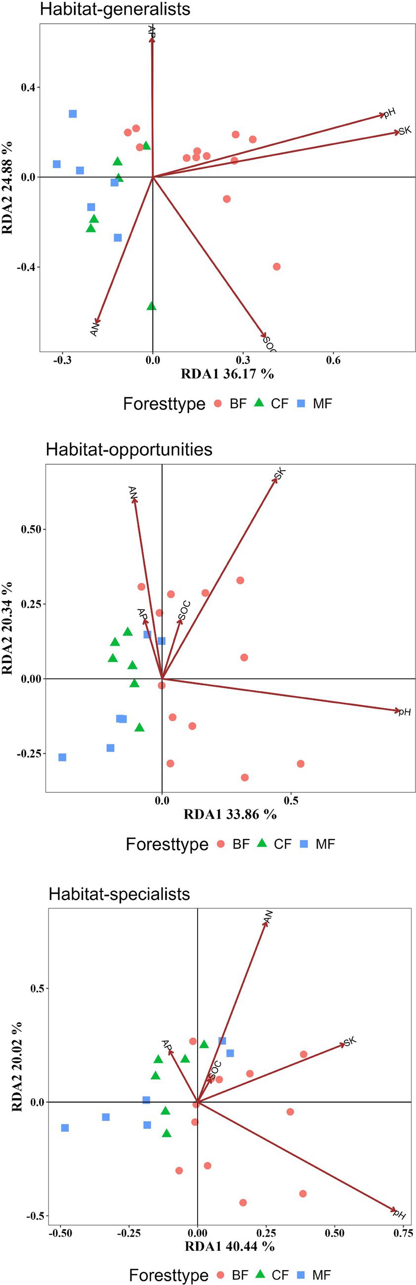 Figure 11. RDA analysis of the impact of soil properties on the structure of each habitat-specialization group (CF, coniferous forest; MF, mixed forest; BF, broadleaved forest).