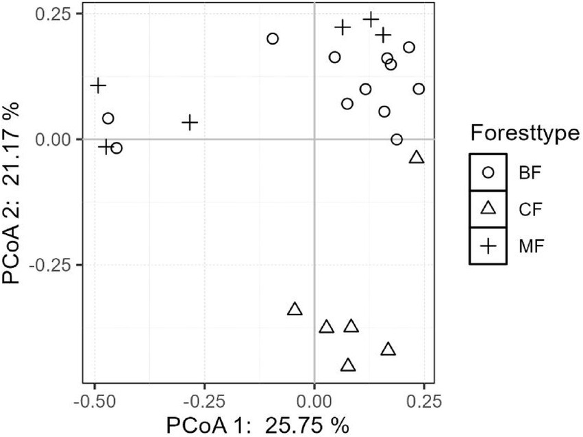 Methods: In this study, we grouped soil fungi from plantations of coniferous forests (CF), mixed forests (MF) and broad-leaved forests (BF) into habitat-generalists, specialists and opportunists based on niche breadth, and examined how forest type shapes their diversity, community structure and co-occurrence networks along a habitat-specialization gradient.