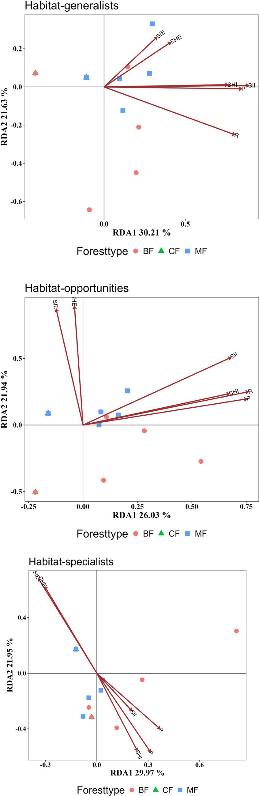 Figure 9. RDA analysis of the impact of plant diversity indices on the structure of each habitat-specialization group (CF, coniferous forest; MF, mixed forest; BF, broadleaved forest; R, Species Richness; SHI, Shannon-Winner Index; SII, Simpson Index; SHE, Shannon Evenness Index; SIE, Simpson Evenness Index; P, Pielou Evenness Index).