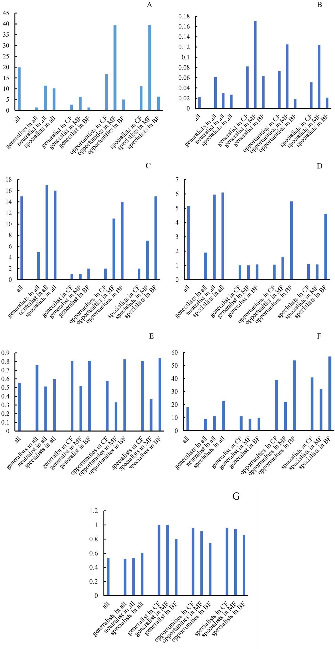 Figure 12. Difference of network topological index among forest stands for each habitat-specialization group (A: average weighted degree; B: density of graph; C: network diameter; D: average path length; E: modular; F: connective component; G: average clustering coefficient; CF, coniferous forest; MF, mixed forest; BF, broadleaved forest).