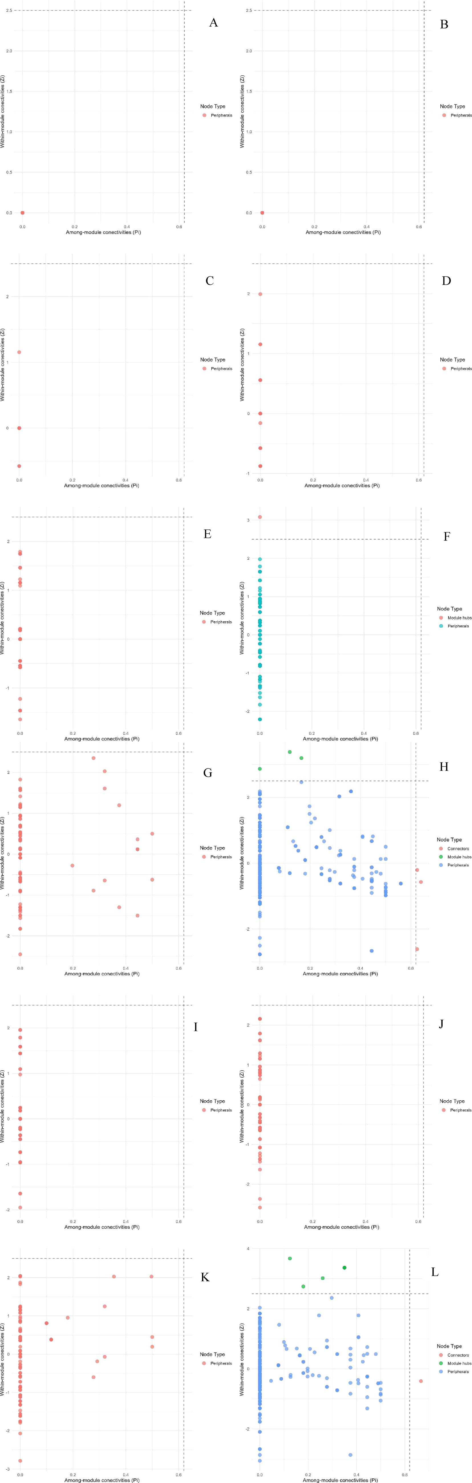 Moreover, the “igraph” package was employed to calculate the within-module connectivity (Zi) and between-module connectivity (Pi) of the constructed network, aiming to identify key species. Based on within-module connectivity (Zi) and among-module connectivity (Pi), ASVs were classified into network hubs (Zi ≥ 2.5; Pi ≥ 0.62), module hubs (Zi ≥ 2.5; Pi < 0.62), connectors (Zi < 2.5; Pi ≥ 0.62), and peripherals (Zi < 2.5; Pi < 0.62) Generally, the other three types of nodes except peripherals were classified as key nodes (Deng et al., 2012), and these nodes played a crucial role in maintaining the stability of the network structure (Hu et al., 2024).