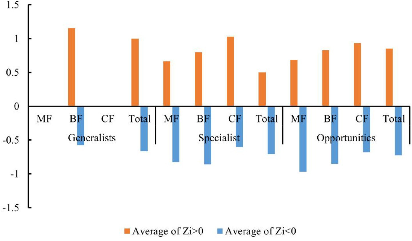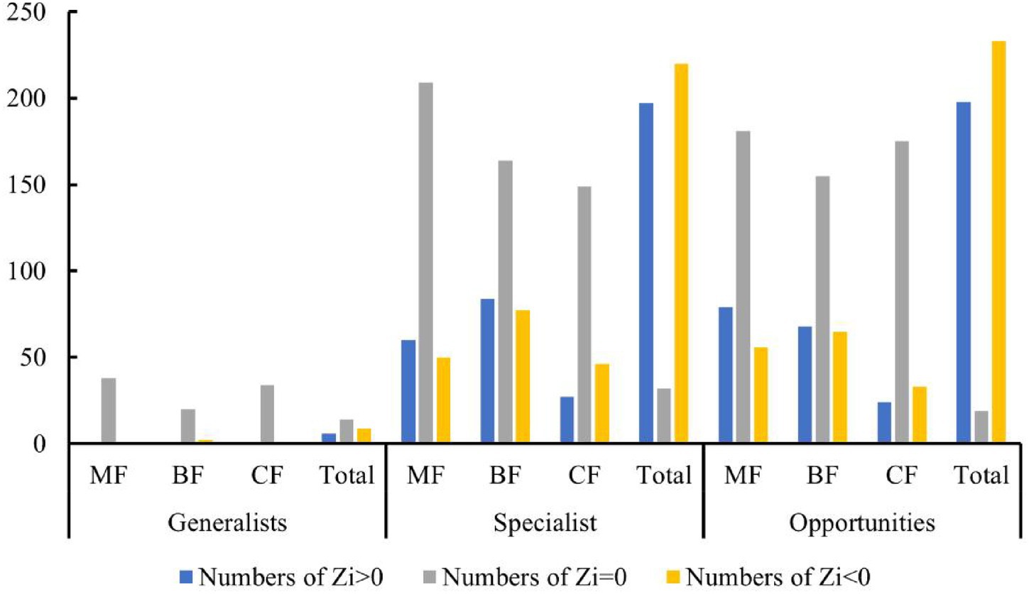 Figure 15. Differences of average positive and negative Zi values among forest types of each habitat-specialization group (CF, coniferous forest; MF, mixed forest; BF, broadleaf forest).