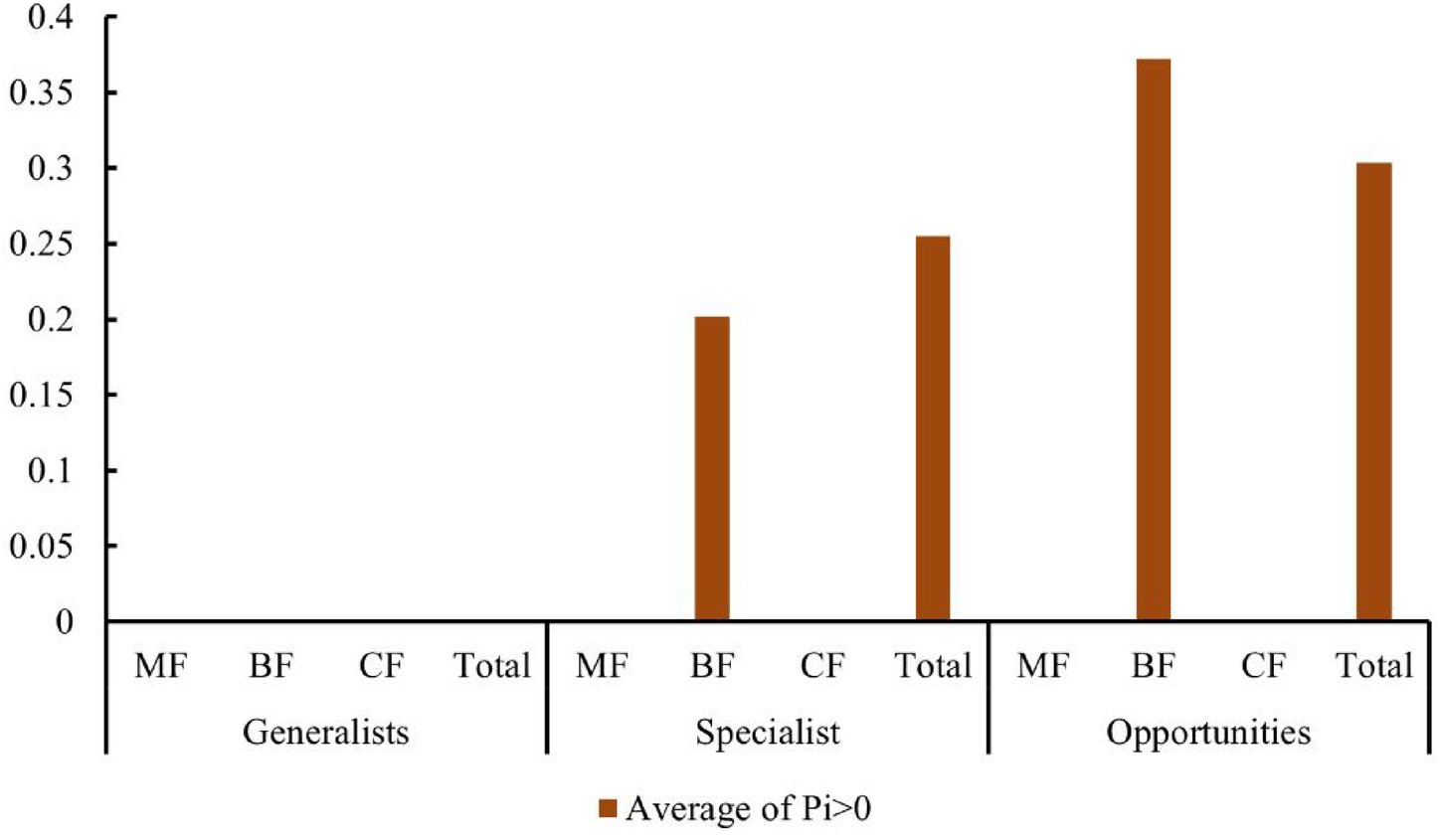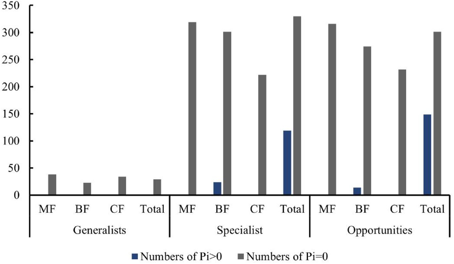Figure 16. Differences of numbers of positive and 0 Pi values among forest types of each habitat-specialization group (CF, coniferous forest; MF, mixed forest; BF, broadleaf forest).