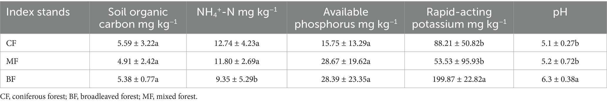 The biological and abiotic components in forest soil interact with various environmental factors, interconnecting through material cycling and energy flow, thereby facilitating their turnover and stability, and forming a soil ecosystem (Zhu et al., 2022). Soil microorganisms, as the most important biological components of soil ecosystems, typically exhibited rapid responses and high turnover rates to environmental changes. The ecological linkages between aboveground and belowground biota during forest succession have been considered an important mechanism in forest development and succession (Guo et al., 2024). For example, changes in plant species strongly influenced the community structure and function of soil microorganisms (Nagati et al., 2018). The key factor is that litter input alters soil abiotic properties such as pH and nutrient availability (Deng et al., 2016). Soil fungi, acting as decomposers, symbionts, and pathogens, are essential functional components of the soil. Extracellular enzymes produced by fungi participate in the cycling and metabolism of soil C, N, and P, significantly affecting the decomposition of plant litter (Lin et al., 2018; Li et al., 2018). Fungal biomass is sensitive to changes in soil properties, and generally higher in broad-leaved forests than in coniferous forests (Noll et al., 2016). Saprophytic soil fungi can decompose soil substrates and enhance soil nutrient cycling (Nagati et al., 2018; Liu et al., 2018), while ectomycorrhizal fungi (Preetisri et al., 2017), as symbionts, are known to improve plant nutrition status (Becquer et al., 2018; Clasen et al., 2018).