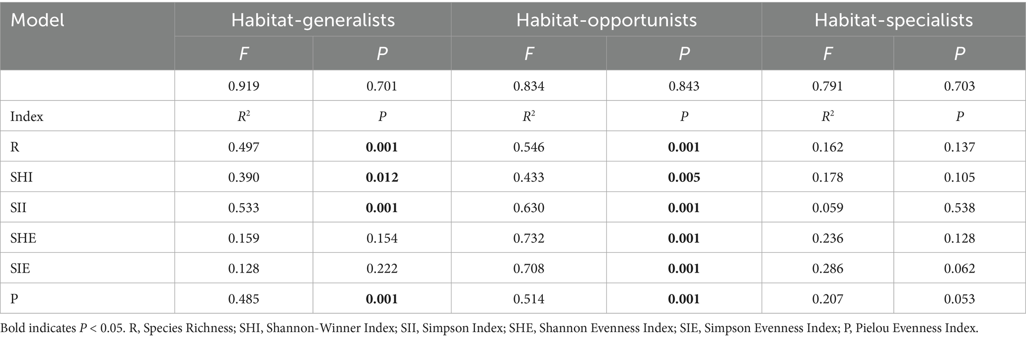 Research results indicated the structure of habitat opportunists was more significantly influenced by plant community diversity indices. All diversity indices collectively explain the structure of habitat opportunities at an extremely significant level (p < 0.01). In contrast, habitat specialists were not significantly affected by plant diversity indices (Figure 9, Table 2).