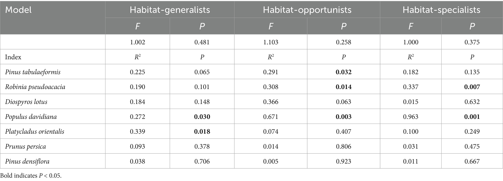 Studies have shown that the differences in the community structure of habitat-specialists between afforestation types were all influenced by the dominant tree species within the communities. The structural differences of habitat generalists among afforestation types were significantly influenced by the importance values of Populus davidiana and Platycladus orientalis. Habitat-opportunities were significantly affected by the importance values of Pinus tabulaeformis, Robinia pseudoacacia, and Populus davidiana. The habitat-specialists were significantly influenced by the importance values of Robinia pseudoacacia and Populus davidiana. The structural characteristics of each habitat-specialists vary from coniferous forests, mixed forests to broad-leaved forests, showing a positive correlation with the increase of Populus davidiana importance values and the decrease of Pinus tabulaeformis and Platycladus orientalis importance values (Figure 10, Table 3).