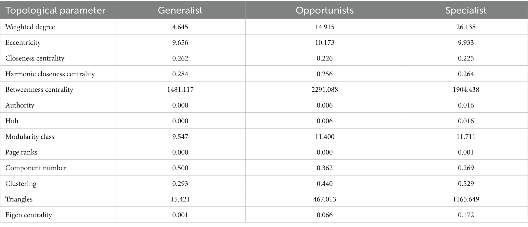 Table 5. Comparison of topological parameters of network structures for each habitat specialization group.