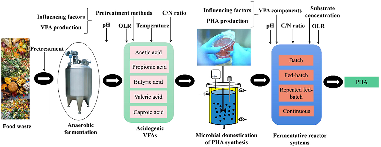 Currently, the PHA generation from food waste as a substrate has been reviewed, focusing on the treatment, disposal, composition, hydrolysis, and pretreatment of food waste, as well as PHA synthesis (Chavan et al., 2023; Liu et al., 2025). However, the mechanisms, key influencing factors, technological processes, and techno-economic analysis in VFAs obtained from food waste for generating PHA are often neglected. In this review, we outlined the composition, classification, microorganisms, and synthetic pathways of PHA from food waste-based VFAs. A complete technological process for food waste–VFAs–PHA generation was presented. Meanwhile, the key factors in the PHA synthesis from food waste-based VFAs and recent advances in this field were examined. Furthermore, we evaluated the techno-economic and environmental analyses of food waste–VFAs–PHA generation. Finally, the current challenges and prospects were presented.