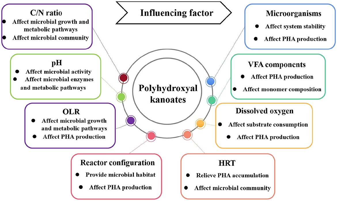 PHA generated from food waste digestate is influenced by factors such as VFA components, pH, C/N ratio, dissolved oxygen, OLR, and carbon source composition (Figure 3). These factors can influence microbial community structure, microbial activity, and microbial metabolic pathways, which further affect the PHA production. Optimization of these influencing factors can maximize PHA production, which is essential for industrial-scale applications.