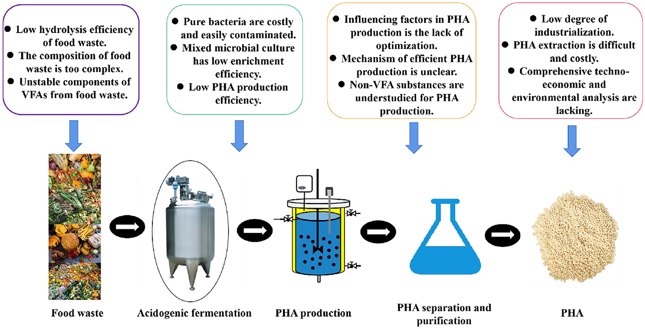 Though VFAs obtained from food waste to generate PHA greatly reduce costs, providing a new model for PHA production (Liang et al., 2024), some challenges still need to be addressed (Figure 4).