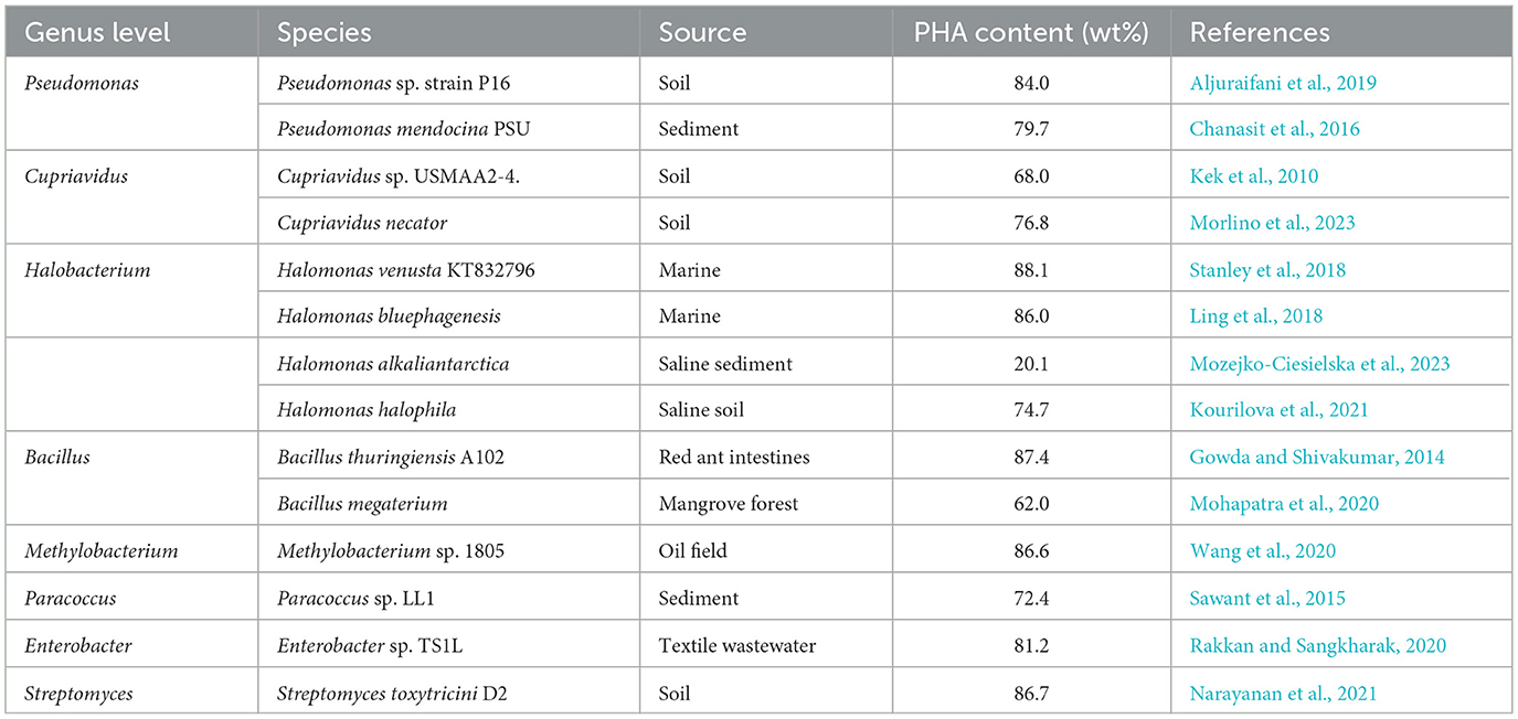 Currently, both pure and mixed microbial cultures are used for PHA synthesis. Fast-growing, adaptable, high-yielding, and efficient PHA synthesis strains or communities are a key area of research, representing an important direction. To date, nearly 100 genera of microorganisms have been isolated from different natural ecosystems for PHA generation (Fu et al., 2023). These strains, screened from natural ecosystems, have demonstrated a good ability to produce PHA (Table 1), including Halomonas, Cupriavidus, Pseudomonas, Methylotrophs, and Azoobacter, among others. With the development of molecular biology, some genetically engineered bacteria capable of producing PHA efficiently have been constructed. For example, the recombinant Escherichia coli constructed by Jung et al. (2019) produced PHA accounting for up to 66% of the dry cell weight, which was 25–28 times higher than that of the wild strain. The disadvantage of pure microbial cultures is the high cost. Thus, strategies such as increasing strain yields, utilizing inexpensive materials, and developing open fermentation techniques have been employed to reduce the production cost of PHA (Chavan et al., 2023; Fu et al., 2023).