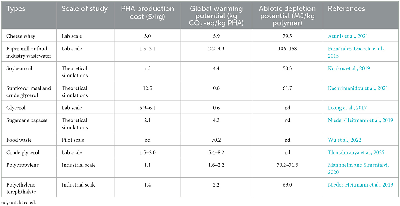 Presently, the cost competitiveness and environmental friendliness are the main factors limiting the industrial PHA generation as a viable alternative to petrochemical plastics. The production cost of PHA using a single substrate (e.g., glycerol, glucose, sucrose) is $3.0–6.1/kg, significantly higher than the current market price of polypropylene and polyethylene terephthalate ($1.1–1.4/kg) (Table 3). To further improve the economic viability of PHA generation, the development of various food wastes as inexpensive carbon sources can effectively reduce production costs. Gnaim et al. (2025) reported that the lowest achievable cost for producing 1,871 ton/year of PHA reached $4.6/kg using Cobetia amphilecti from celery waste. On a large scale of 10,000 ton/year, the production cost of PHA was estimated to be $1.5–3.0/kg utilizing sugarcane bagasse as a substrate (Nieder-Heitmann et al., 2019). Meanwhile, in a study with an annual production of 50,000 ton of PHA using rice straw and softwood as substrates, the production cost of PHA was $3.5–3.9/kg, which was lower than that of glucose (Ozturk et al., 2025). Additionally, Zahari et al. (2015) reported that the estimated production cost of oil palm leaves as substrate was $3.4/kg due to the lower production efficiency, slightly higher than that using sugarcane bagasse ($2.1/kg) (Nieder-Heitmann et al., 2019) and crude glycerol ($1.5–2.0/kg) (Thanahiranya et al., 2025). Thus, PHA generation from food waste as a substrate contributes to reducing costs. Meanwhile, further reductions in production costs and improvements in PHA production efficiency are still needed to maintain cost competitiveness with petrochemical peers.