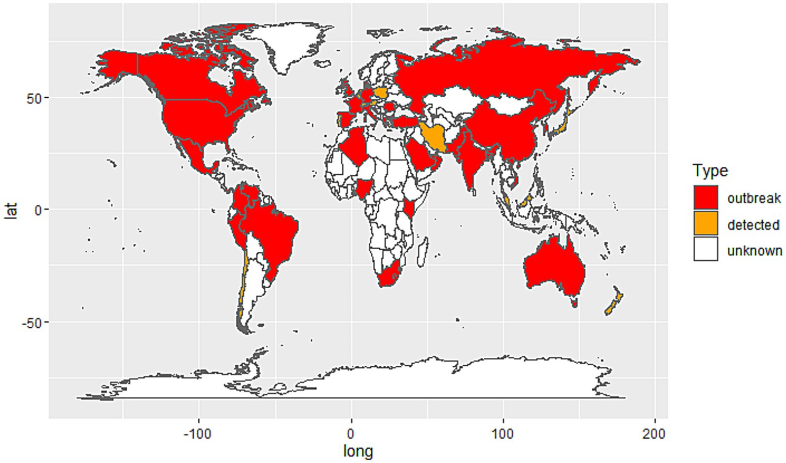 Figure 1. Global distribution of Candida auris cases by country. Red: Countries with documented C. auris outbreaks (confirmed local transmission or nosocomial clusters). Orange: Countries where C. auris has been detected but no outbreaks have been reported; White: Countries with no reported cases or insufficient data.
