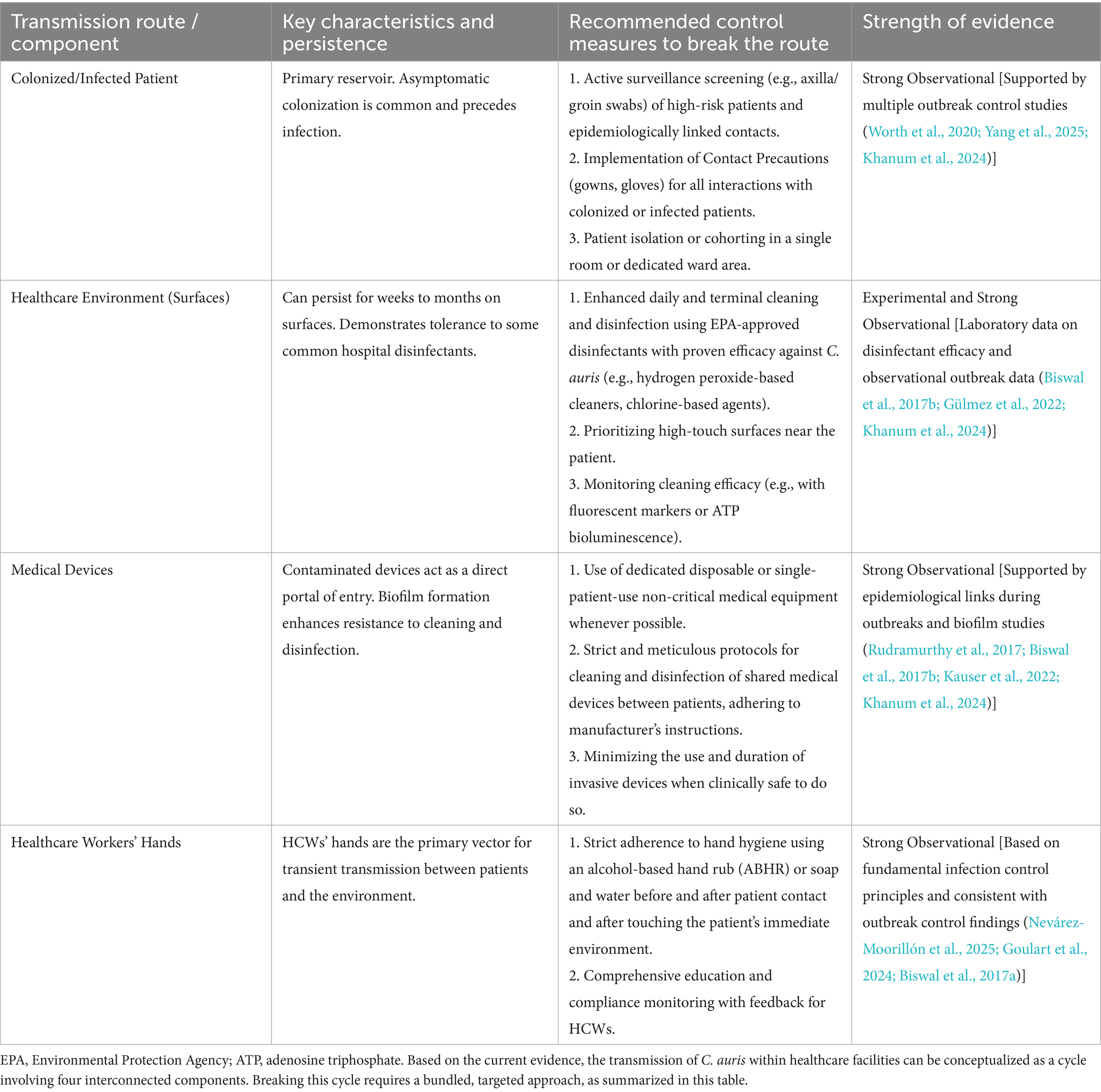 Table 1. Evidence-based strategies to break the transmission cycle of Candida auris in healthcare settings.