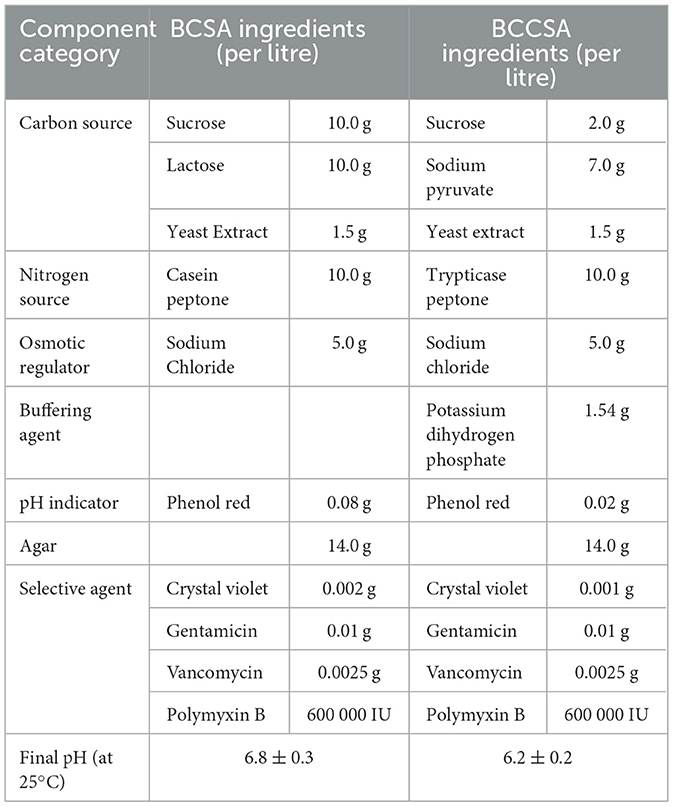 A correction has also been made to the section 2 “Materials and Methods”, sub-section 2.1 “Culture Media”, Paragraph 1: “The components of BCSA and BCCSA are shown in Table 1. BCSA (product ref:11317) and supplement (product ref: 11317a) was obtained from Beijing SanYao Science & Technology Co., Ltd, Beijing, China, and prepared in accordance with manufacturer's instructions. The composition (per liter of distilled water) of BCCSA is as follows: sucrose 2.0 g, sodium pyruvate 7.0 g, trypticase peptone 10.0 g, NaCl 5.0 g, yeast extract 1.5 g, KH2PO4 1.54 g, phenol red 0.02 g, crystal violet 0.001 g, agar 14.0 g, polymyxin B sulphate 600 000 IU, gentamicin 0.01 g, vancomycin 0.0025 g. The phenol red and crystal violet were prepared as 0.2% and 0.01% aqueous solutions, respectively, and 10 ml of each was added per liter. After autoclaving for 15 min at 121 °C, antibiotics were added when the medium is cooled to around 50 °C. Soybean-Casein Digest Agar (TSA, ref: 236950), Soybean-Casein Digest Broth (TSB, ref: 211825) and Sabouraud Dextrose Broth (SDB, ref: 238230) was obtained from Becton-Dickinson, Rungis, France.”