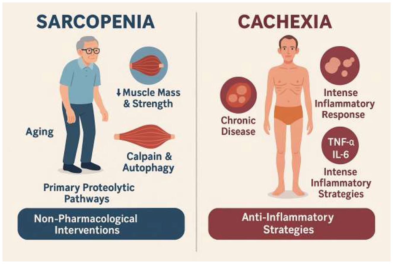 Figure 1. Comparative overview of sarcopenia and cachexia. Sarcopenia is an aging-associated muscle disease characterized by progressive loss of muscle mass and strength with minimal fat loss. Its pathogenesis involves calpain and autophagy pathways, with inconsistent UPS involvement, and is typically accompanied by low-grade inflammation. These features make it more responsive to non-pharmacological interventions such as exercise and nutrition. Cachexia, in contrast, is a severe wasting syndrome linked to chronic diseases (e.g., cancer, heart failure, AIDS), characterized by loss of both fat and fat-free mass, and driven by intense systemic inflammation mediated by TNF-α and IL-6. It activates proteolytic pathways including UPS, NF-κB, STAT3, and myostatin, requiring aggressive anti-inflammatory and multimodal therapeutic strategies.
