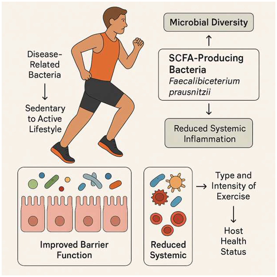 As a key behavioral input, physical activity does not act on muscle in isolation; instead, it serves as a powerful regulator of the entire gut-muscle axis. Physical activity is a powerful environmental factor that can reshape the gut microbiota. Numerous studies have shown that exercise enhances microbial diversity and enriches the microflora with beneficial species (Lapauw et al., 2024; Dziewiecka et al., 2022; Campaniello et al., 2022). Athletes and active individuals generally exhibit greater microbial biodiversity and a higher abundance of SCFA-producing bacteria, such as Faecalibacterium prausnitzii, than their sedentary counterparts (Dziewiecka et al., 2022; Sohail et al., 2019). Longitudinal studies have further confirmed that a transition from a sedentary to an active lifestyle can reduce disease-related bacteria and increase health-associated taxa (Boytar et al., 2023; Lelonek et al., 2025). This positive modulation of the gut microbiota, which includes improved barrier function and reduced systemic inflammation, is a key mechanism by which exercise promotes overall health and mitigates disease (Monda et al., 2017; Dmytriv et al., 2024).