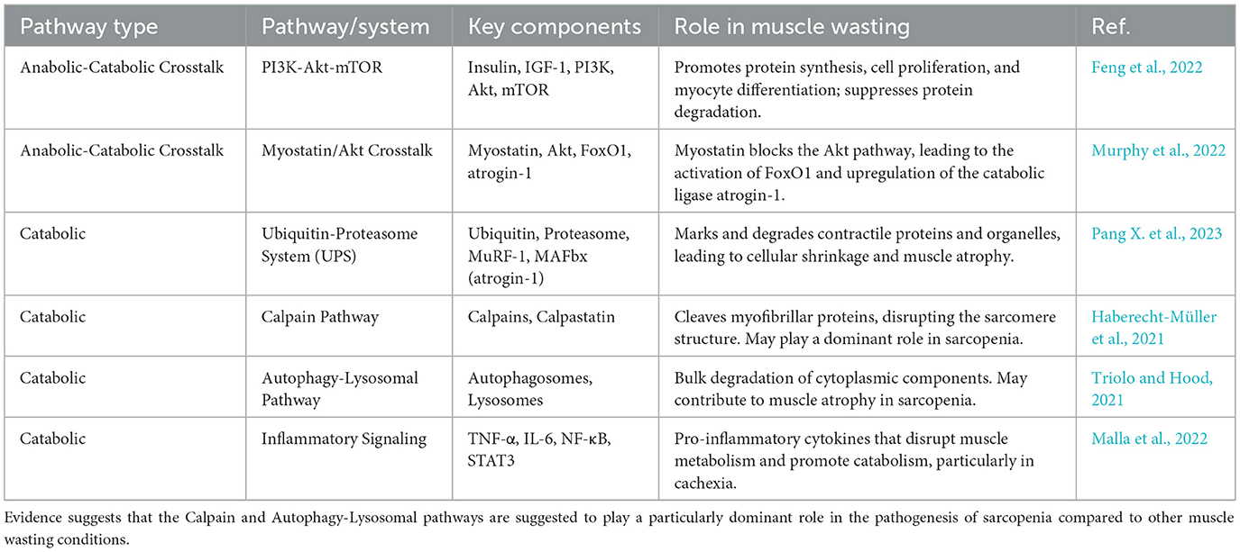Although both are muscle wasting disorders, sarcopenia and cachexia have distinct underlying mechanisms and clinical presentations (Wang et al., 2025; Rausch et al., 2021). This distinction is critical for tailoring effective therapeutic strategies. Sarcopenia is a muscle disease often associated with aging, and is primarily characterized by a progressive loss of muscle mass and strength without significant fat loss (Wang et al., 2025; Najm et al., 2024). While the UPS is involved, existing evidence is inconsistent, suggesting that other proteolytic pathways, particularly the calpain and autophagy pathways, may play a more dominant role in sarcopenia pathogenesis (Pang X. et al., 2023; Bowen et al., 2015). Sarcopenia is often associated with mild, or even undetectable, systemic inflammation, in contrast to the intense inflammatory state of cachexia (Wang et al., 2025; Jimenez-Gutierrez et al., 2022). This lower inflammatory burden may make sarcopenia more responsive to certain non-pharmacological interventions (Ispoglou et al., 2023; Clerton, 2025).