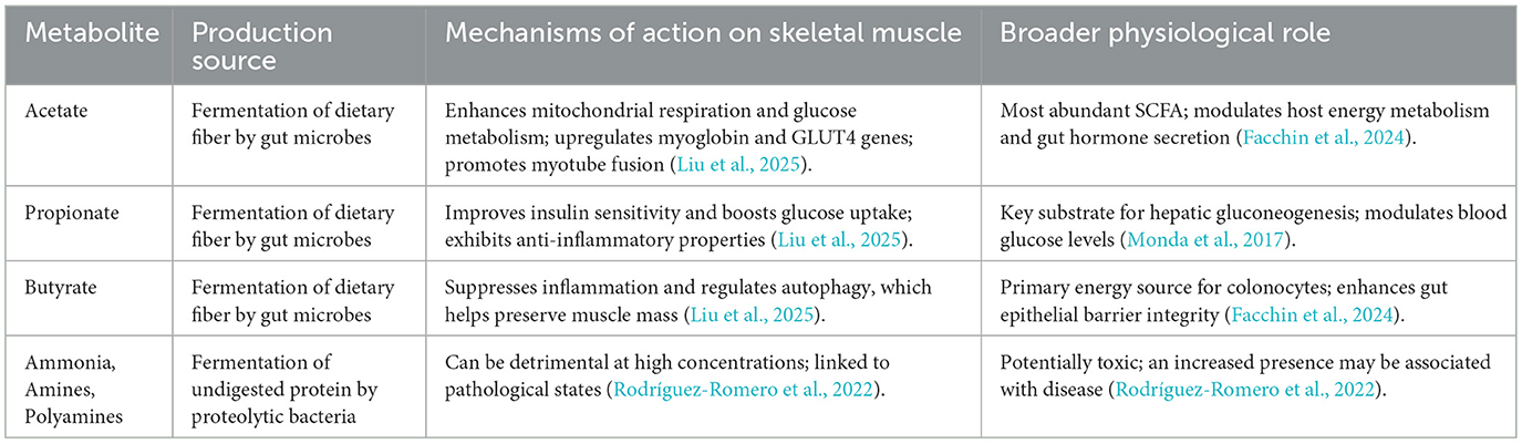 Although less abundant, butyrate is often highlighted for its pivotal role in gut health and systemic anti-inflammatory effects. It is the primary energy source for colonocytes, enhancing the integrity of the intestinal epithelial barrier (Facchin et al., 2024; Salvi and Cowles, 2021). Importantly for muscle health, butyrate has been shown to support muscle mass preservation by suppressing inflammation and regulating autophagy, a key catabolic pathway in muscle wasting (Liu et al., 2025). This detailed understanding of the individual functions of SCFAs provides a rationale for personalized dietary and microbial interventions designed to modulate specific SCFA production for different clinical outcomes (Rauf and Khalil, 2022).