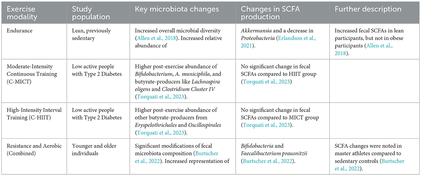 However, the effects of exercise on the gut microbiota are not universal; they are contingent on several variables, including the type and intensity of exercise, as well as the host's health status (Bonomini-Gnutzmann et al., 2022; Cataldi et al., 2022). For example, a six-week endurance exercise intervention increased fecal SCFAs in lean but not obese participants (Allen et al., 2018). This suggests that obesity-related dysbiosis or inflammation may blunt the gut's metabolic response to exercise. A separate study on individuals with type 2 diabetes found that different exercise intensities increased the abundance of distinct butyrate-producing species (Torquati et al., 2023). Moderate-intensity continuous training (MICT) led to a higher relative abundance of Lachnospira eligens (Torquati et al., 2023) and Clostridium Cluster IV (Torquati et al., 2023), while high-intensity interval training (HIIT) promoted other butyrate-producers from Eryspelothrichales and Oscillospirales (Torquati et al., 2023). This finding is significant because it indicates that different exercise prescriptions can specifically target and modulate distinct microbial communities and their functions (Figure 2 and Table 3).