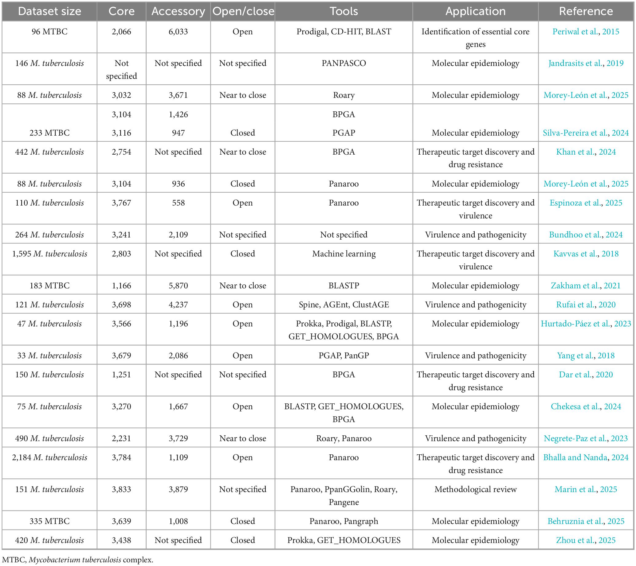 A principal source of variation in pangenome architecture arises from the choice of computational tool used for pangenome construction. Software such as Roary (Page et al., 2015), BPGA (Chaudhari et al., 2016), and Panaroo (Tonkin-Hill et al., 2020) apply distinct algorithms for ortholog detection, gene clustering, and similarity thresholding. Such differences lead to substantially divergent estimates of pangenome size and composition even when applied to identical datasets. In Mtb, these tool-dependent biases manifest as distinct patterns: Roary’s conservative similarity thresholds tend to fragment repetitive gene families, artificially inflating accessory genome estimates, while BPGA’s clustering algorithms may inappropriately merge divergent PE/PPE family members, and Panaroo’s stringent error correction, though reducing false positives, can occasionally exclude genuine rare variants characteristic of highly clonal populations (Marin et al., 2025; Behruznia et al., 2025). The heterogeneity observed in reported pangenome sizes (Table 1) illustrates the methodological dependence of M. tuberculosis pangenome estimates. To contextualize these differences, Table 2 provides a comparative overview of the main pipelines, highlighting their strengths, limitations, and applicability to clonal pathogens.