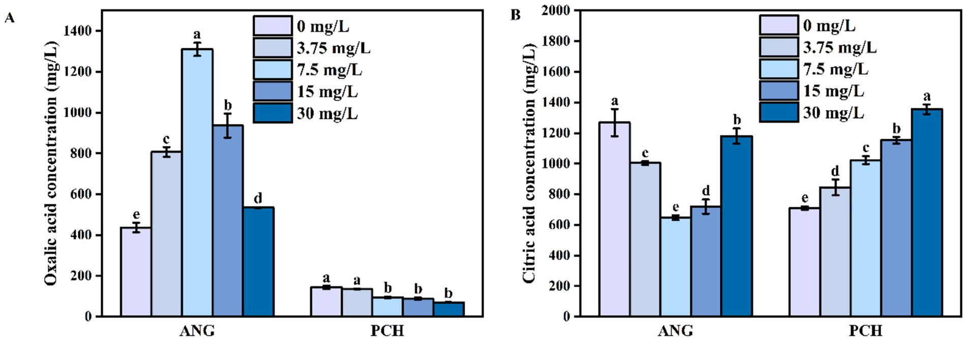 Figure 2. Oxalic acid (A) and citric acid content (B) Aspergillus niger and Penicillium chrysogenum in different Mn2+ conditions after 7 days of incubation. Standard deviations are shown with N = 3. The significant differences across treatments were carried out using Tukey’s honest significant difference test (p < 0.05) after one-way ANOVA. ANG, Aspergillus niger; PCH, Penicillium chrysogenum.