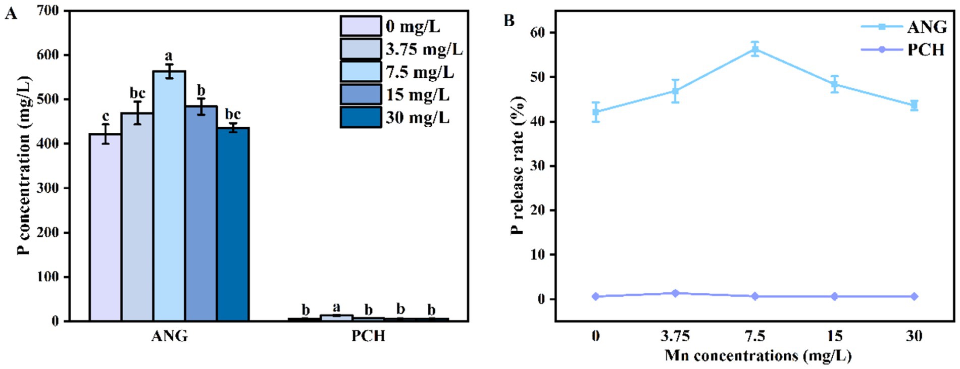 Figure 3. P concentration (A) and P release rate (B) of Aspergillus niger and Penicillium chrysogenum in different Mn2+ conditions after 7 days of incubation. Standard deviations are shown with N = 3. The significant differences across treatments were carried out using Tukey’s honest significant difference test (p < 0.05) after one-way ANOVA. ANG, Aspergillus niger; PCH, Penicillium chrysogenum.
