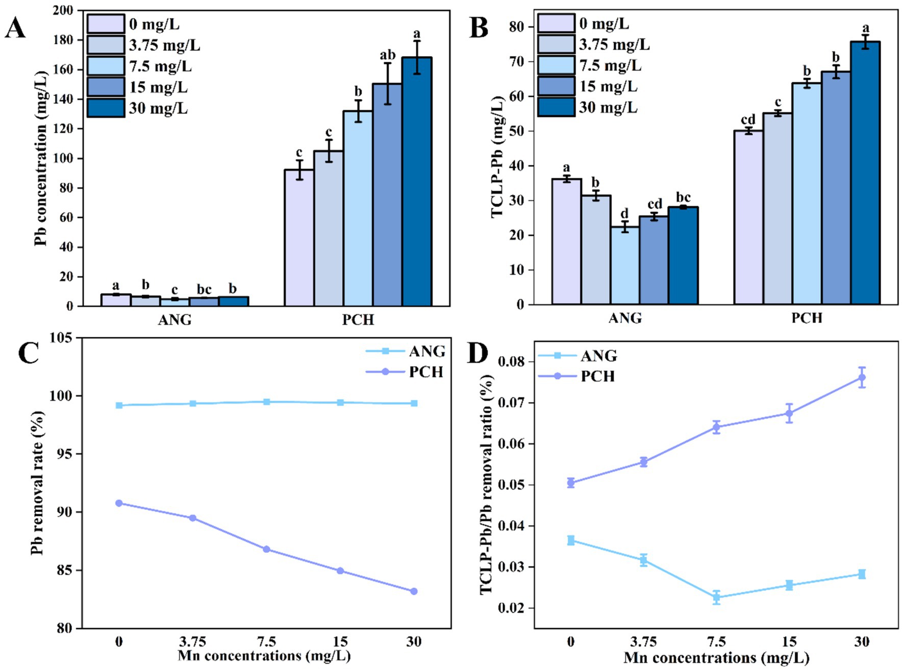 Figure 4. Pb2+ content in solution (A), TCLP-Pb concentration (B), Pb removal ratio (C), and TCLP-Pb/removed Pb ratio (D) of Aspergillus niger and Penicillium chrysogenum in different Mn2+ conditions after 7 days of incubation. Standard deviations are shown with N = 3. The significant differences across treatments were carried out using Tukey’s honest significant difference test (p < 0.05) after one-way ANOVA. ANG, Aspergillus niger; PCH, Penicillium chrysogenum.