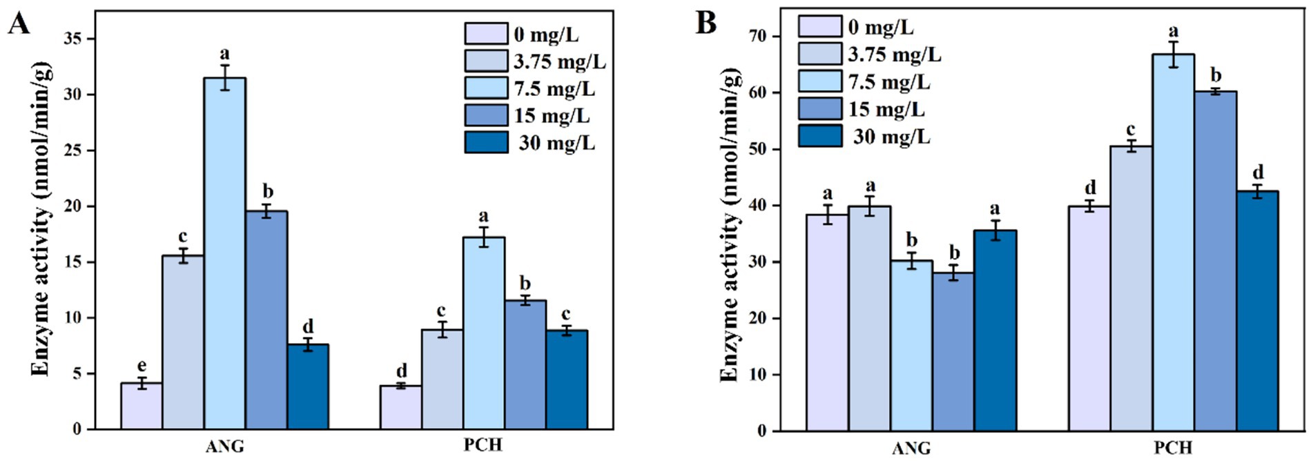 Figure 5. Pyruvate dehydrogenase (PDH) enzyme activities (A) and citrate synthase (CS) enzyme activities (B) of Aspergillus niger and Penicillium chrysogenum in different Mn2+ conditions after 7 days of incubation. Standard deviations are shown with N = 3. The significant differences across treatments were carried out using Tukey’s honest significant difference test (p < 0.05) after one-way ANOVA. ANG, Aspergillus niger; PCH, Penicillium chrysogenum.