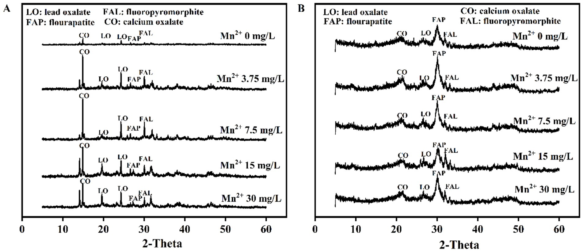 Figure 6. XRD patterns of Aspergillus niger (A) and Penicillium chrysogenum (B) under different Mn2+ concentrations after 7 days of incubation.