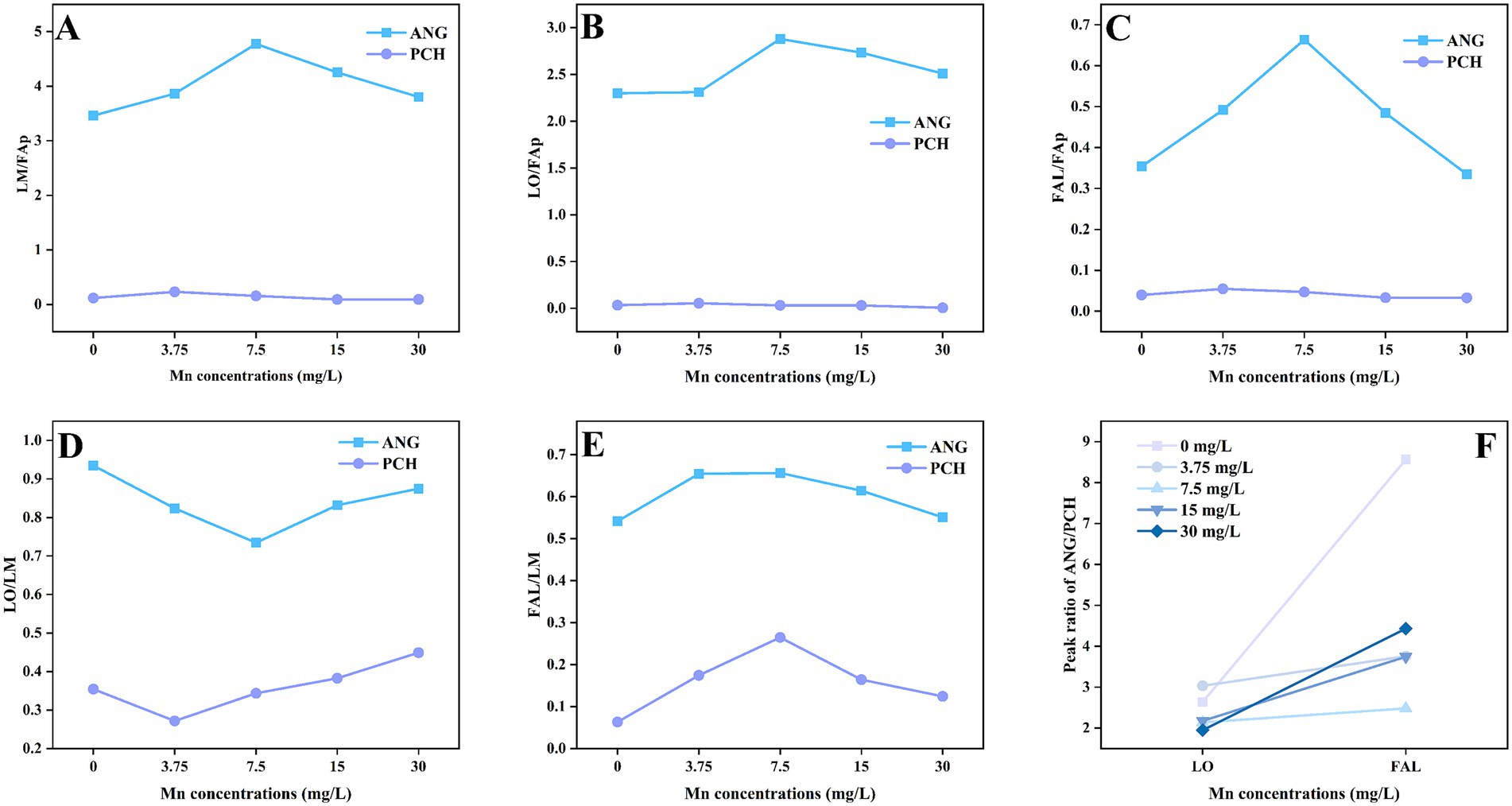Figure 7. Peak area ratio of Pb minerals of Aspergillus niger and Penicillium chrysogenum in different Mn2+ conditions after 7 days of incubation. (A–E) Peak area ratio of LM/FAp, LO/FAp, FAL/FAp, LO/LM, and FAL/LM between ANG and PCH. (F) The peak area ratio between ANG and PCH in the formed LO and FAL. LO, lead oxalate; FAp, fluorapatite; FAL, fluoropyromorphite; LM, lead minerals (LO + FAL); ANG, Aspergillus niger; PCH, Penicillium chrysogenum.