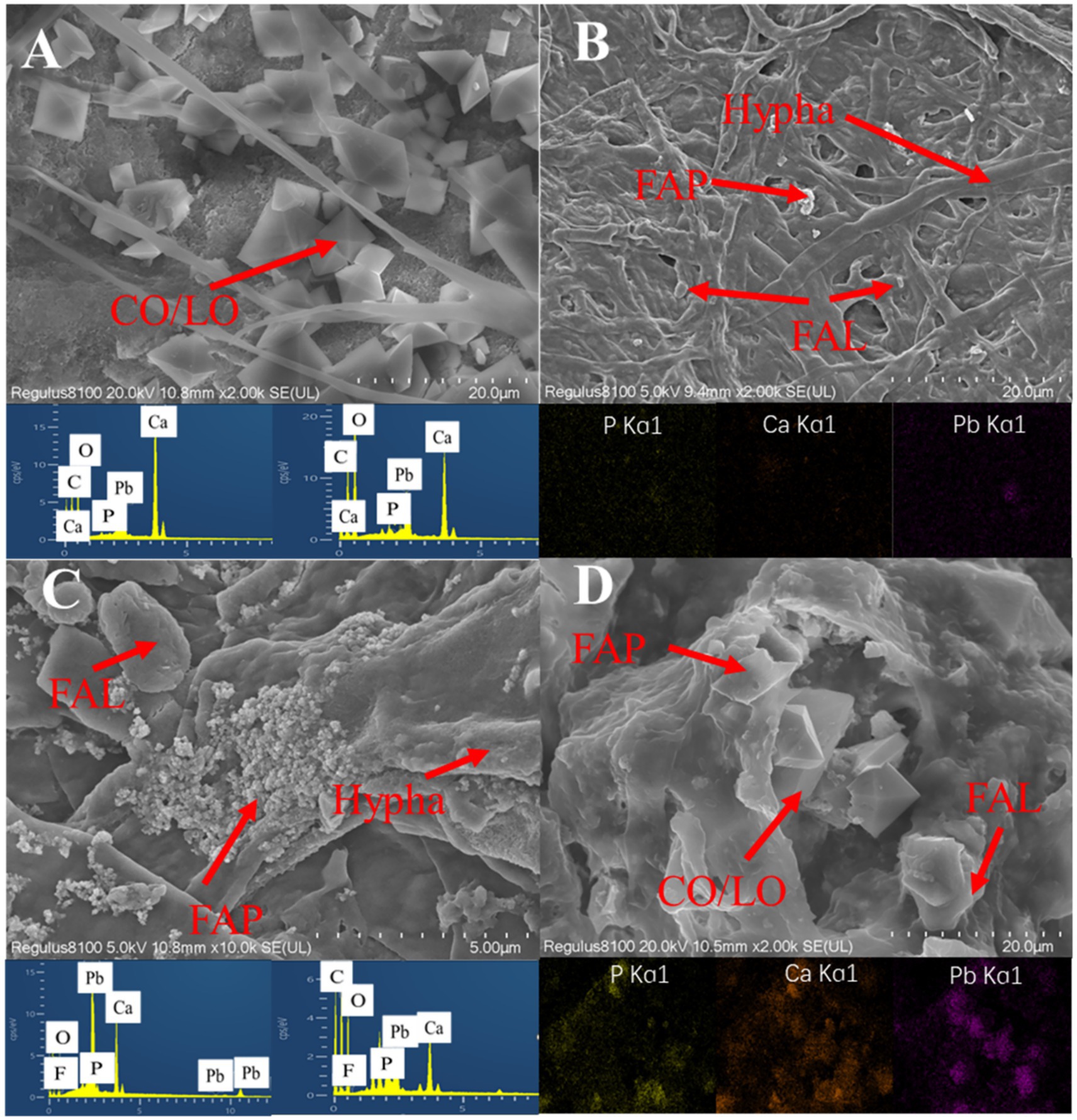 SEM images of Aspergillus niger (7.5 mg/L Mn2+) and Penicillium chrysogenum (3.75 mg/L Mn2+) after 7 days of incubation were shown in Figure 8. Aspergillus niger exhibited robust growth after 7 days, characterized by significant mycelial development encapsulated with calcium oxalate, lead oxalate, and fluoropyromorphite (Figures 8A,B). Similarly, in the presence of Penicillium chrysogenum, the culture displayed the presence of calcium oxalate, lead oxalate, and fluoropyromorphite around the ruptured Penicillium chrysogenum (Figures 8C,D). These findings indicated that the ability of both Aspergillus niger and Penicillium chrysogenum can dissolve FAp and promote Pb immobilization.