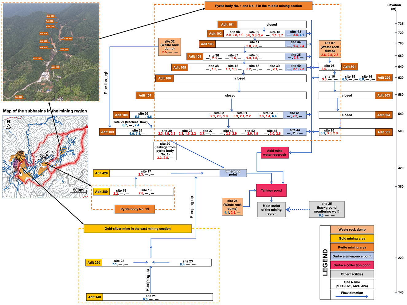 The study was conducted in the Suichang mining area, located in Suichang County, Lishui City, Zhejiang Province, China. The Suichang Mine is situated in the southwestern part of the Shaoxing-Longquan mineral belt. The area contains significant pyrite, gold, and silver deposits, along with medium-sized lead-zinc ore deposits, primarily hosted in metamorphic and volcanic rocks. Mining activities in the region have a long history, dating back to approximately 1,800, with initial large-scale pyrite extraction beginning in 1954 and ceasing in 1976. Following the cessation of mining operations in the pyrite section, extensive underground voids and tunnels were abandoned. Rainwater infiltrates into waste rock dumps in the valley or through shallower fractures into voids and tunnels, leading to the dissolution and oxidation of sulfide minerals. This process generates approximately 600,000 m3 of acidic mine drainage annually, characterized by low pH and elevated concentrations of heavy metals. The mining area spans from elevation 460 m to 735 m with a network of tunnels in 10 levels. Sampling was conducted at various locations, including inside mine tunnels (from small streams, dripping points, ponds, and reservoirs), at tunnel exits (from discharging streams), and outside the tunnels (in tailings ponds, water storage areas, and surrounding groundwater) (Figure 1).