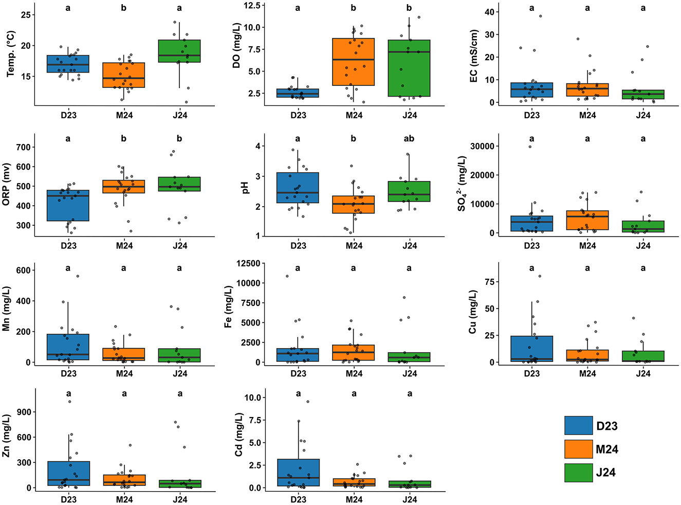Figure 2. Physicochemical parameters of the acidified samples (pH < 4) collected during the three sampling events. Significant differences among sampling events were assessed using Kruskal–Wallis tests followed by Dunn's post-hoc comparisons with Bonferroni correction. Different letters above boxplots indicate significant differences at p < 0.05. For the complete dataset including all samples irrespective of pH, see Supplementary Figure S1.
