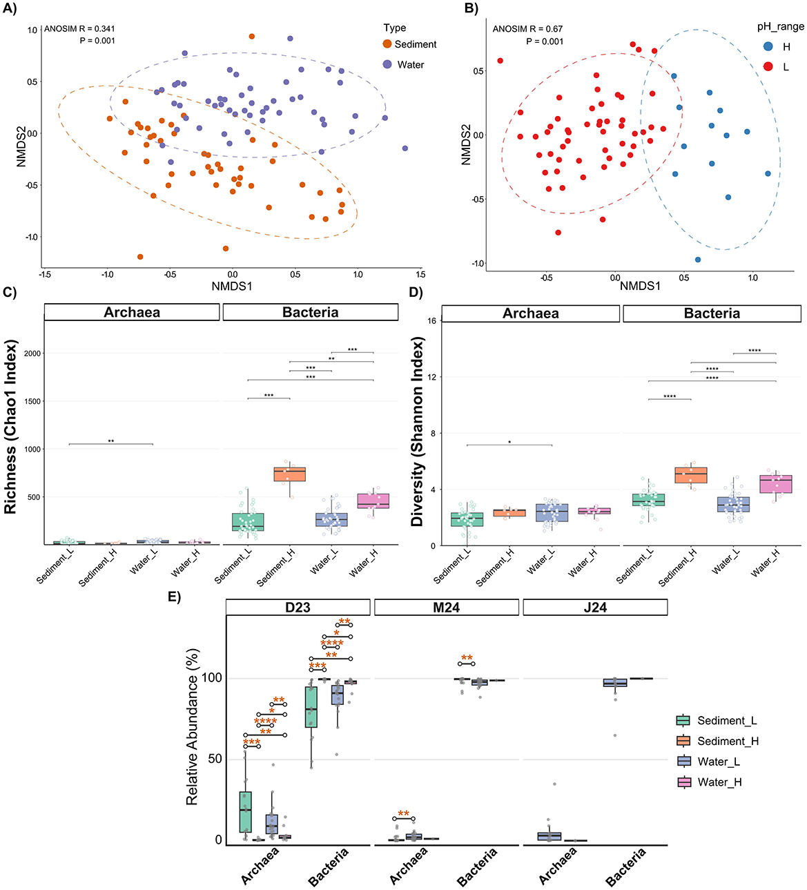 Figure 3. Non-metric multidimensional scaling (NMDS) ordination based on microbial community composition, with sites colored by (A) sample type and (B) pH level. Ellipses represent 95% confidence intervals for each group. Boxplots show (C) alpha richness (Chao1 Index) and (D) alpha diversity (Shannon index) across samples. (E) Relative abundance of Archaea and Bacteria across samples, stratified by sampling time point. Significant differences were assessed with Wilcoxon rank-sum tests with Benjamini–Hochberg FDR correction: ****p.adj < 0.0001; ***p.adj < 0.001; **p.adj < 0.01; *p.adj < 0.05.