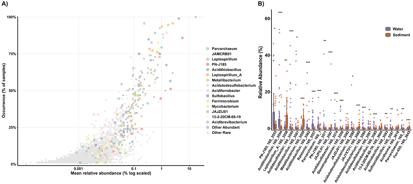 Figure 4. Distribution and habitat specificity of ASVs in acidic samples. (A) ASV occurrence vs. mean relative abundance. Dot color indicates taxonomic affiliation. (B) Relative abundance of the top 25 ASVs with significant differences between water and sediment samples. Significant differences were assessed with Wilcoxon rank-sum tests with Benjamini–Hochberg FDR correction: ***p.adj < 0.001; **p.adj < 0.01; *p.adj < 0.05.