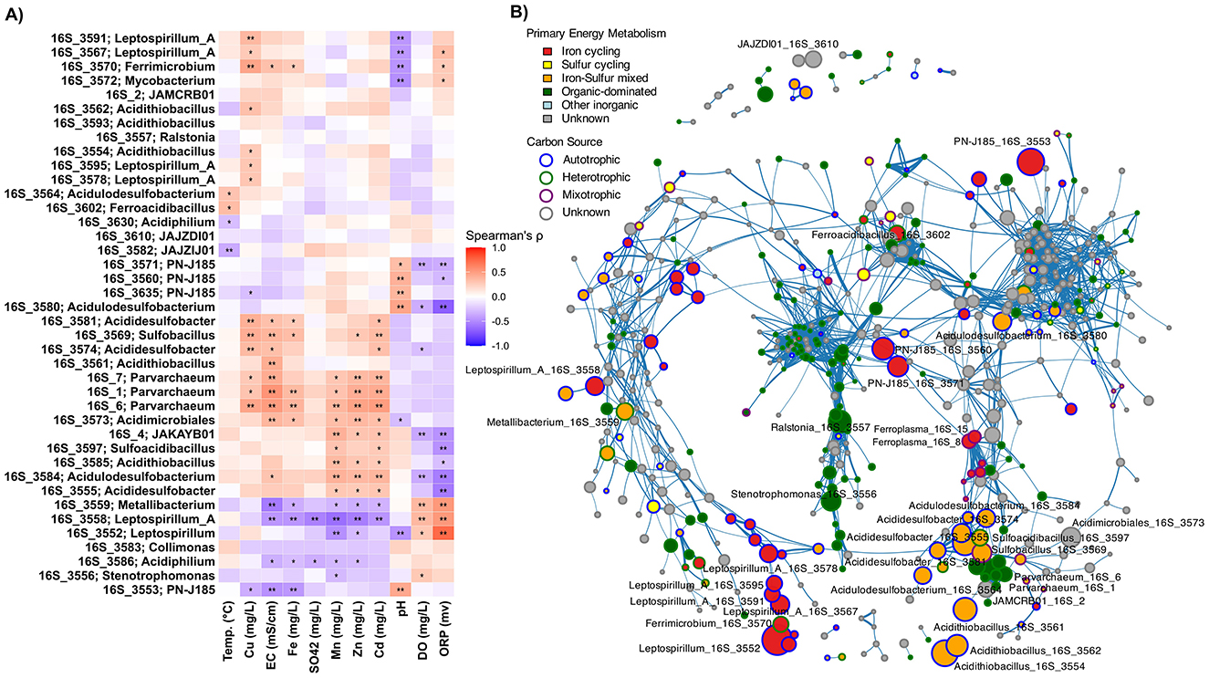 Figure 5. Correlation and co-occurrence patterns among ASVs. (A) Spearman correlations between dominant ASVs and physicochemical parameters in low-pH water samples (pH < 4). Significant correlations are indicated by *p < 0.05 and **p < 0.01. Clustering highlights co-varying ASVs and environmental factors, revealing fine-scale niche partitioning. (B) Network of significant positive correlations among ASVs across all samples (Spearman r ≥ 0.6, FDR-adjusted p < 0.01). Node colors indicate predominant energy metabolism (inner) and carbon source utilization strategy (outer ring), illustrating modular co-occurrence patterns among acidophiles.