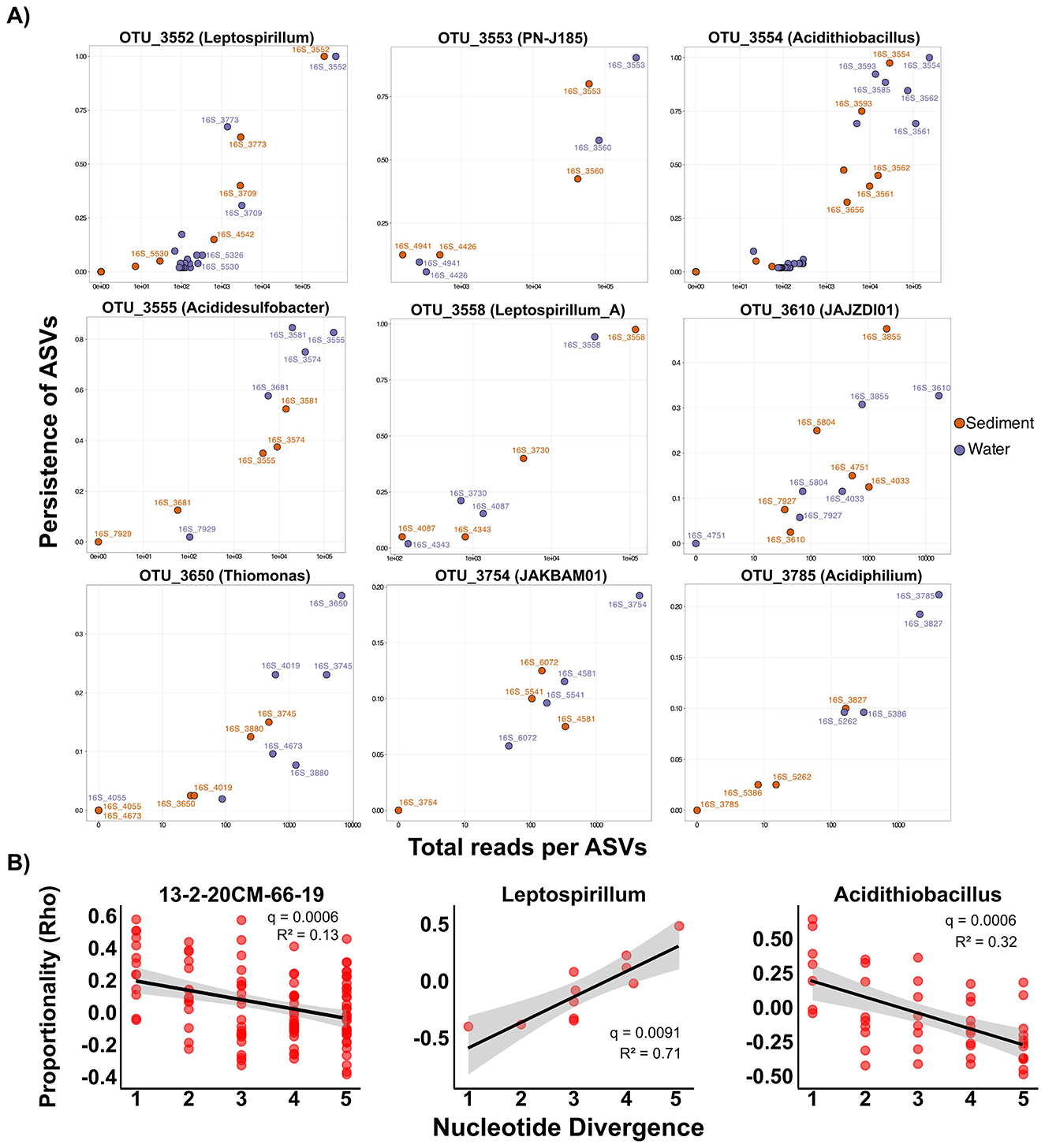 Figure 6. Niche and persistence patterns of ASVs. (A) Scatter plots of log-transformed overall relative abundance (read counts) and persistence for ASVs within OTU in sediment (orange) and water (purple) samples. Each dot represents a single ASV, and the most abundant ASVs across the studied AMD system are labeled with the ASV-IDs. (B) Relationships between pairwise nucleotide divergence and niche similarity (Rho) for genera showing significant correlations (FDR-adjusted p < 0.05). Results for all analyzed genera are provided in Supplementary Figure S12.