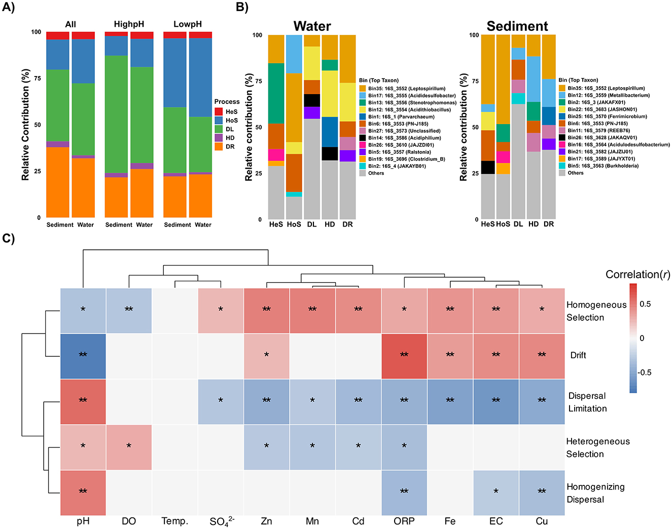 Figure 7. Microbial community assembly processes and environmental drivers. (A) Relative contributions of ecological processes across habitats and pH conditions. (B) Relative abundance of different genera governed by the distinct assembly processes (HeS and HoS deterministic processes, while DL, HD and DR as stochastic processes) for water (left) and sediment (right) samples. (C) Correlation between physicochemical parameters and ecological assembly processes. Differences in process proportions between groups were tested using Wilcoxon rank-sum tests with Benjamini–Hochberg FDR correction. Significance is indicated by symbols: **p ≤ 0.01; *p ≤ 0.05.