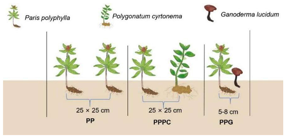 Two medicinal plants, Polygonatum cyrtonema and Ganoderma lucidum, share similar ecological characteristics with P. polyphylla. All three species are shade- tolerant plants and exhibit complementary ecological traits. Notably, P. cyrtonema enhances soil phosphorus and potassium availability via root-secreted organic acids (Lu et al., 2025; Chen et al., 2002), whereas G. lucidum, a white rot fungus, decomposes lignocellulose through its mycelial network, thereby releasing bioavailable potassium and secreting polysaccharides that induce plant resistance (Fang et al., 2024). However, systematic investigations remain limited regarding whether the tripartite “plant-fungus-plant” interactions among these species can selectively reconstruct the rhizosphere microecology of P. polyphylla and improve the quality of its medicinal components. This study focuses on P. polyphylla, which is notably affected by continuous cropping obstacles. Three cultivation regimes were established: monoculture of P. polyphylla (PP), intercropping with P. cyrtonema (PPPC), and intercropping with G. lucidum (PPG). The present research examines changes in agronomic traits, active ingredient concentrations, rhizosphere soil physicochemical properties, and microbial community composition of P. polyphylla. Furthermore, it explores the effects of intercropping on the quality of P. polyphylla and elucidates the underlying mechanisms, thereby providing a theoretical foundation and technical framework for the high-efficiency cultivation of this species.
