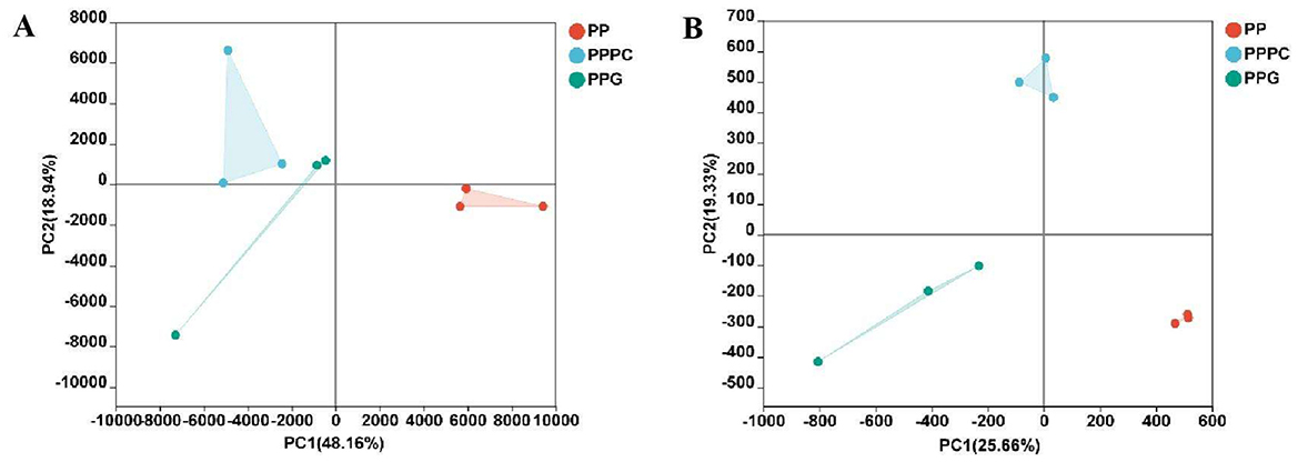 In contrast, bacterial alpha diversity indices revealed no significant differences in the Ace, Chao, and Sobs indices among the PP, PPPC, and PPG treatments (Table 4). Notably, the Ace, Chao, Shannon, and Sobs indices were marginally higher in the PP treatment relative to PPPC and PPG. PCA revealed significant differences in bacterial community structures in the PPPC and PPG treatments differed significantly from those observed in the PP treatment (Figure 2B).